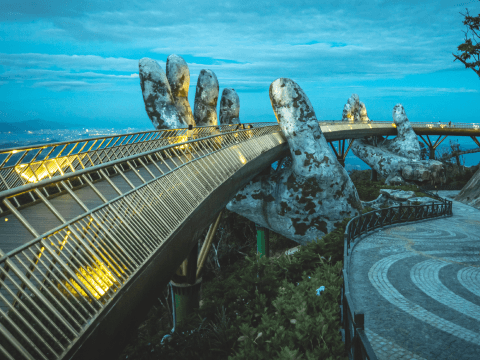 ダナン市街からタクシーで約40分に位置する遊園地・バーナーヒルズ。約150mの橋を支えるのは巨大な神の手!ほかにも、フランス風のエリアやアジアらしいエリアなど多様な風景を楽しむことができます。すてきな写真をたくさん撮ってみてはいかがでしょうか📷