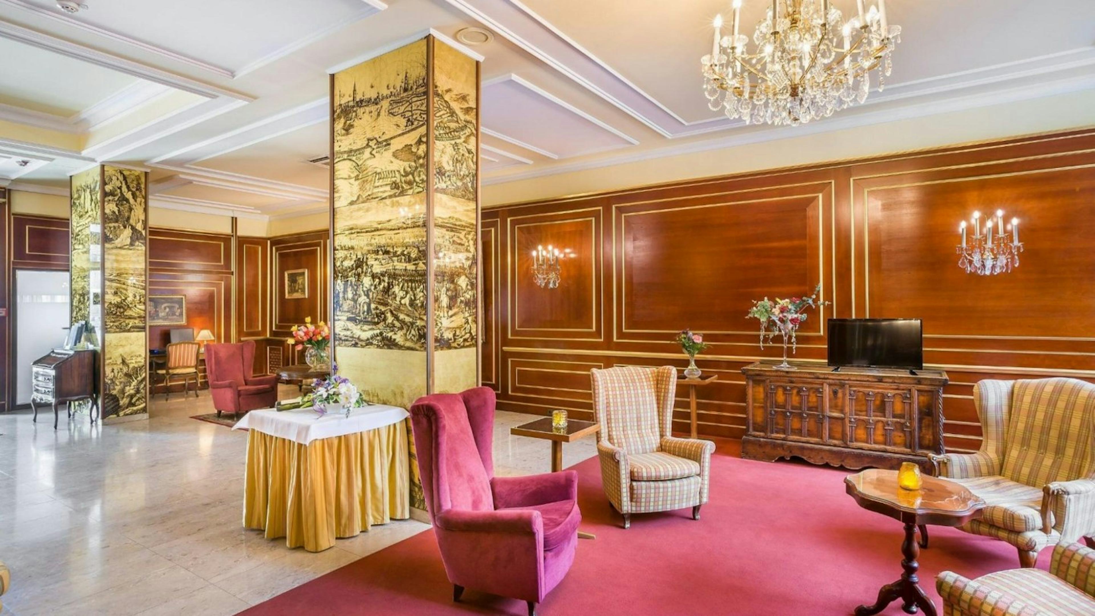 ゴールドを基調としたエレガントなロビー。部屋へと続くゴージャスな階段がひときわ目を引きます。壁に飾られた絵画やアンティーク調のインテリアなど、ウィーンの歴史にちなんだ数々の装飾は見どころです。