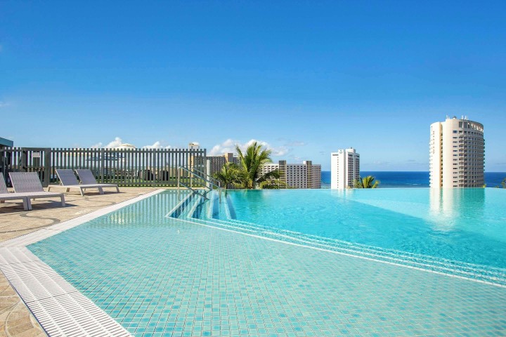 タモン地区の中心にあり、ショッピングやグルメも楽しめるコスパばつぐんのホテル。インフィニティプールではサンセットや夜景を堪能でき、リゾート気分を楽しめます。