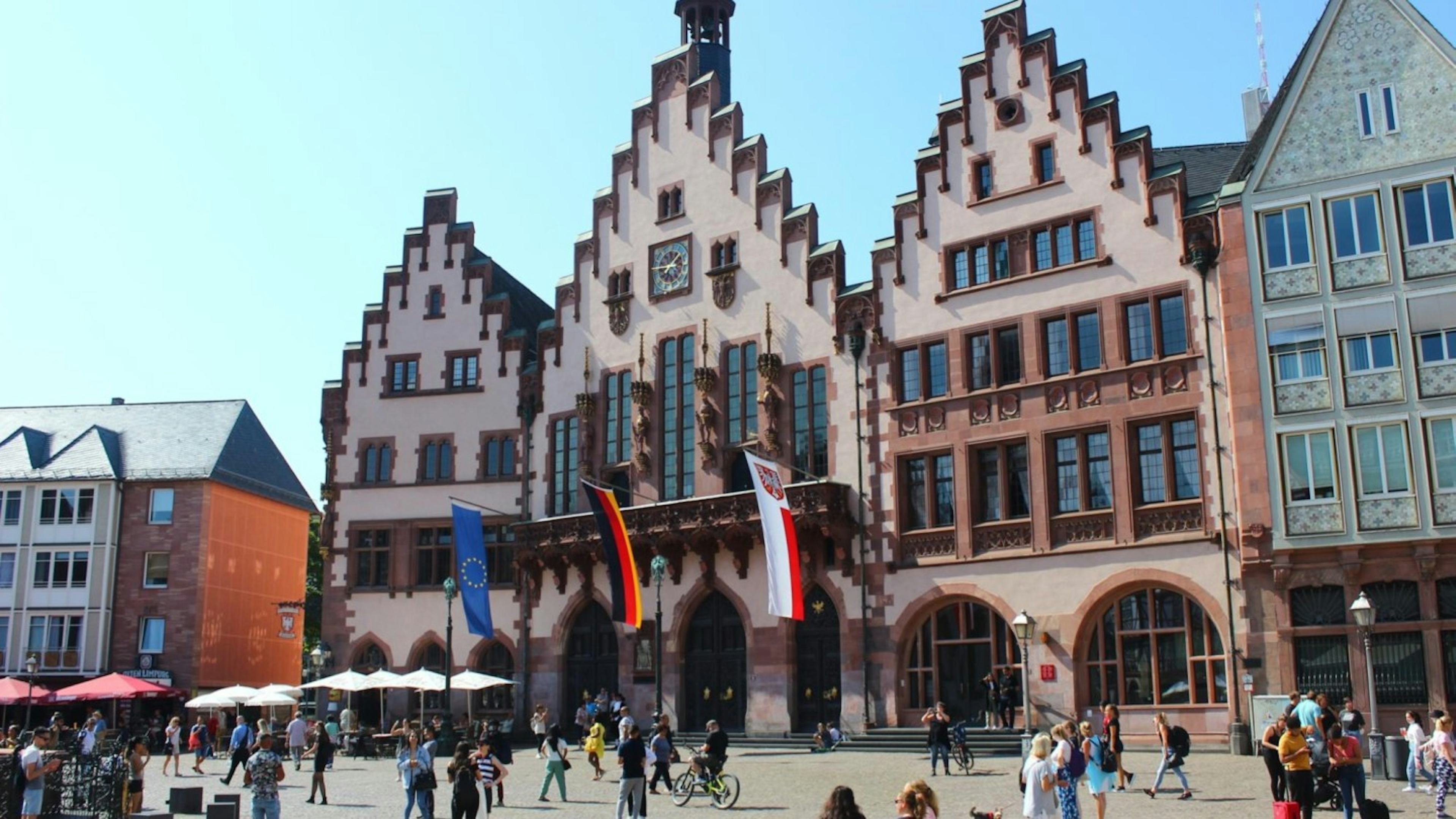 レーマー広場の象徴となっているのが、ピンク色の建物が愛らしいフランクフルト市庁舎。フランクフルトにある建築物でも特に古いものの1つで、1405年以来、600年以上の歴史があります。もともとは既存の家を買取り、市庁舎として機能させたことがはじまりと言われています。