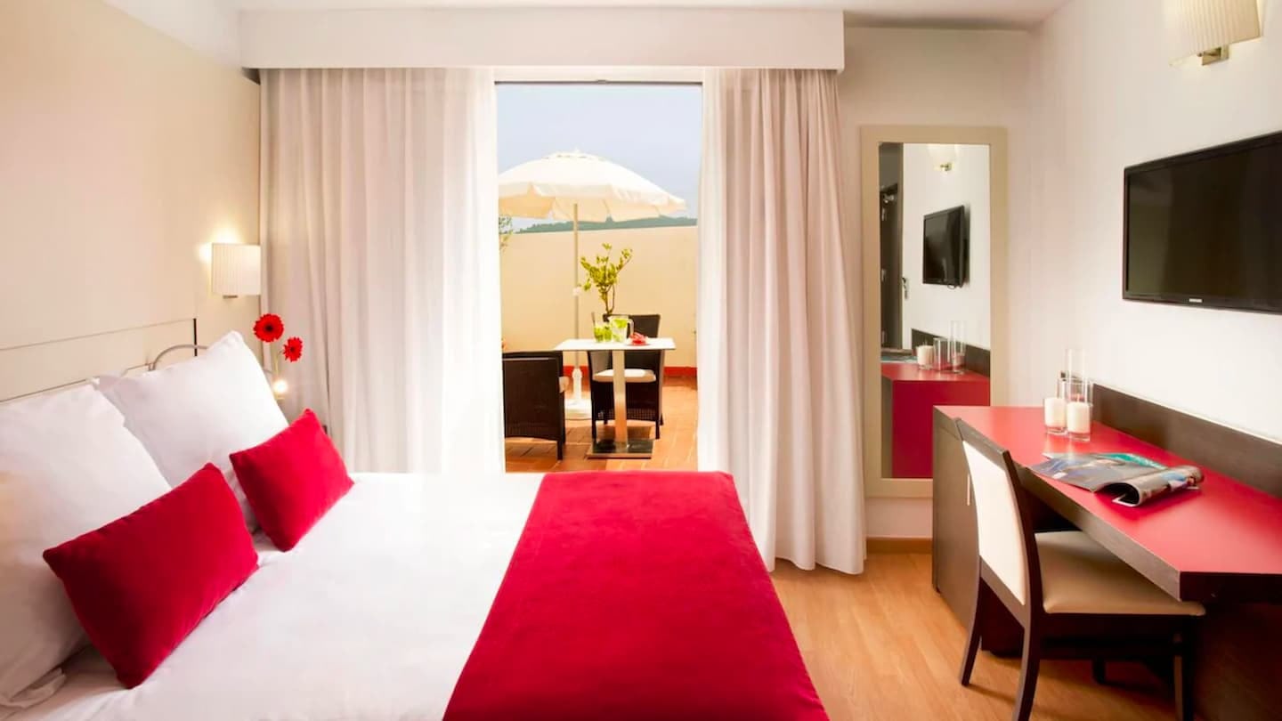 グルポテル グラビナで一番ベーシックなお部屋はダブルルームです。18平米のコンパクトなお部屋ですが、スーツケースを広げるスペースはあります。赤いアクセントカラーがスタイリッシュでおしゃれな雰囲気です。お部屋の窓からは、バルセロナの街または中庭を眺めることができます。リーズナブルですが、快適に過ごすことができますよ。