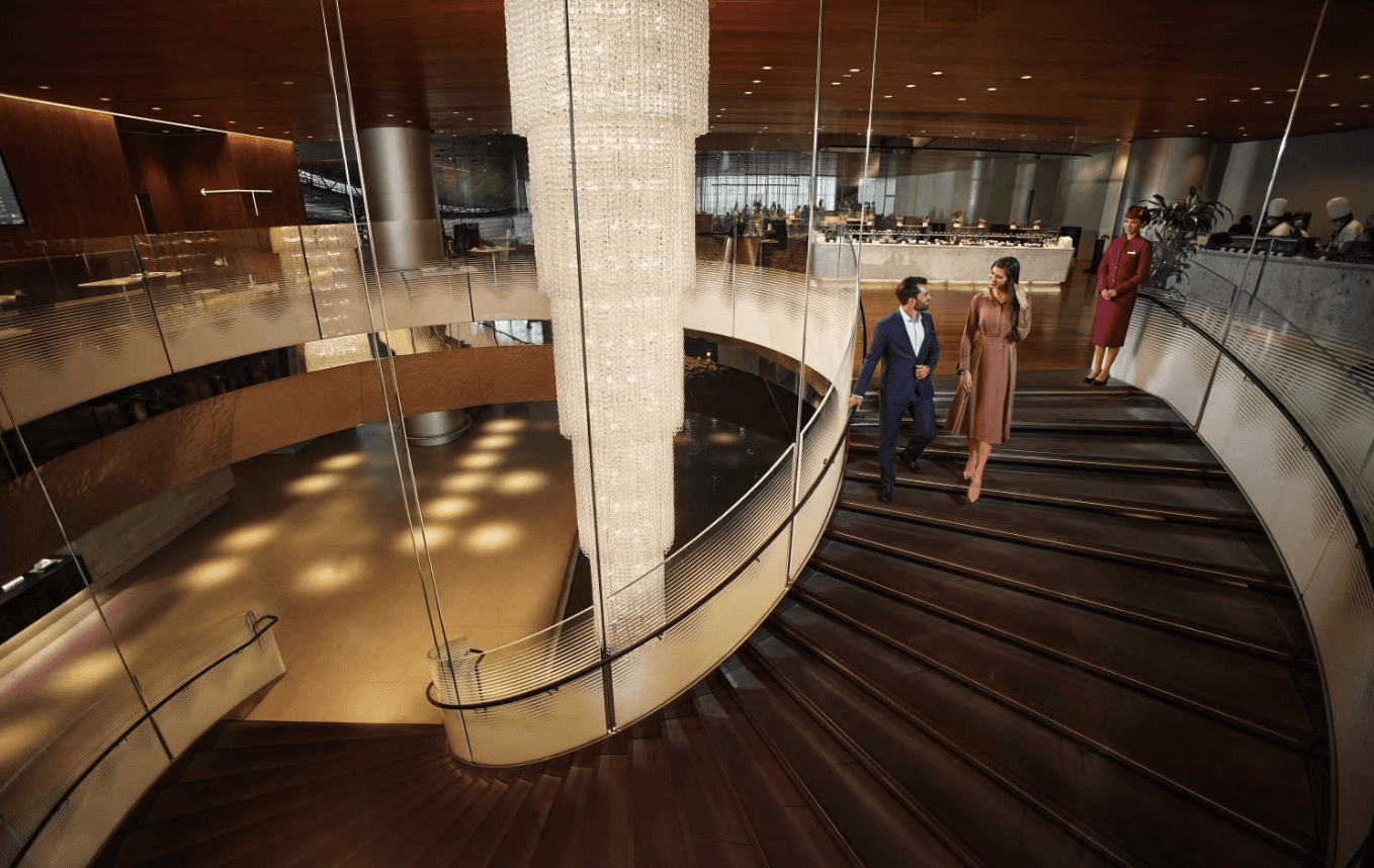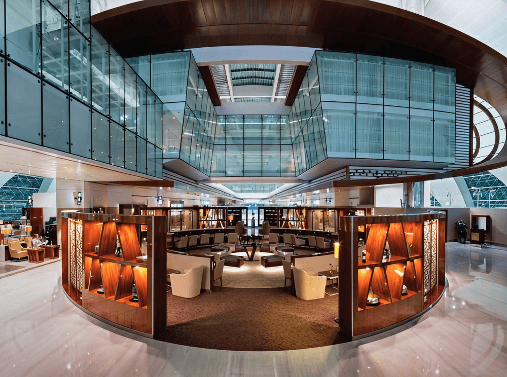 カタール航空の拠点、ドーハにある「アル・ムルジャン ビジネスラウンジ」は、ホテルのような広さと豪華さを持つ特別な空間。シャンデリアが輝く吹き抜けのある広いダイニングエリアで、上質な料理やドリンクを楽しみながら、静かにリラックスできるぜいたくなひとときを過ごせます。
