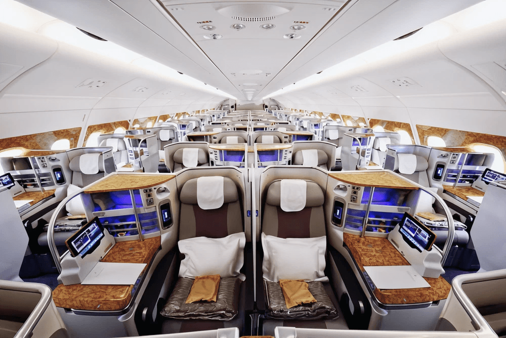 エミレーツ航空A380では、シャンパン色のレザーが高級感を演出する1-2-1配列のフルフラットシートが特徴です。繊細な刺繍が入った柔らかなヘッドレストやオリジナルのミニバーもあり、木目調の高級インテリアとあわせて、まるでホテルのようなぜいたくを体験できます。