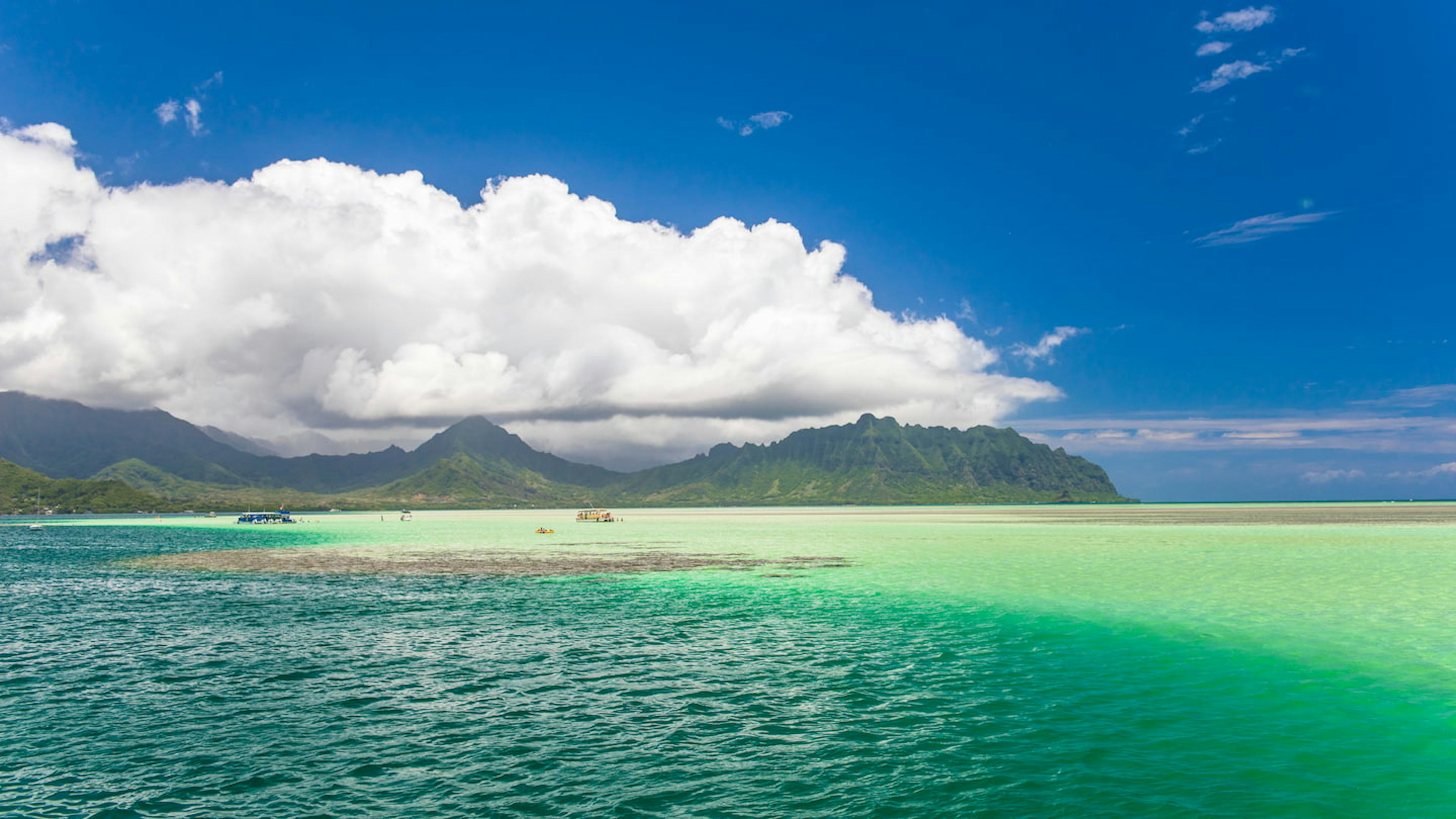 天国の海の特徴となっているのが、サンドバー。砂が堆積し、干潮の時だけ陸地となる場所です。サンドバーがあるのはカネオヘ湾沖で、オアフ島から約800メートルの距離にあり、沿岸からは見ることができません。ボートでしか行くことができないスポットです。