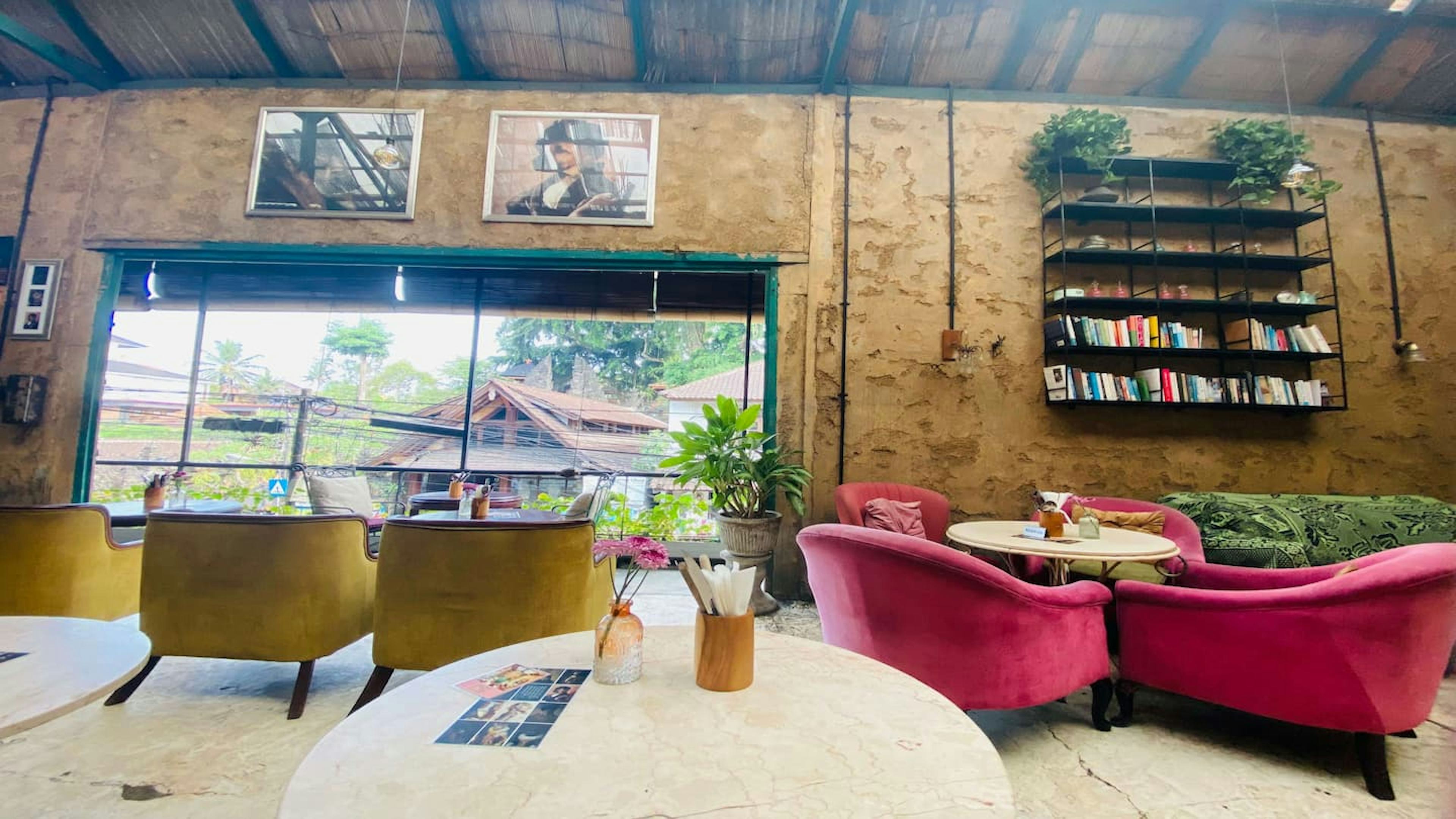 続いてご紹介するウブドのおすすめカフェはLazy Cats Cafe(レイジー キャッツ カフェ)です。入り口には、お店の名前にちなんで大きな猫の肖像画があり、古いお屋敷のようなデザインが見どころ。