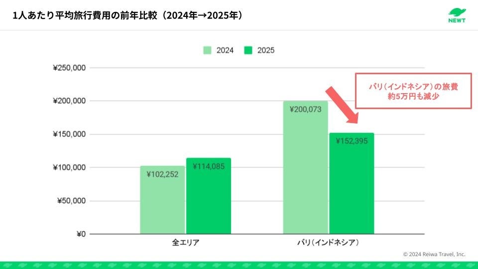 今回の調査で特に注目すべきは、全エリア平均の旅行費用が上昇する中、バリ(インドネシア)の旅行費用が前年と比較して約5万円も安くなっているという事実です。NEWTの予約データから、バリ(インドネシア)がおトクな旅先として急浮上していることが明らかになりました。