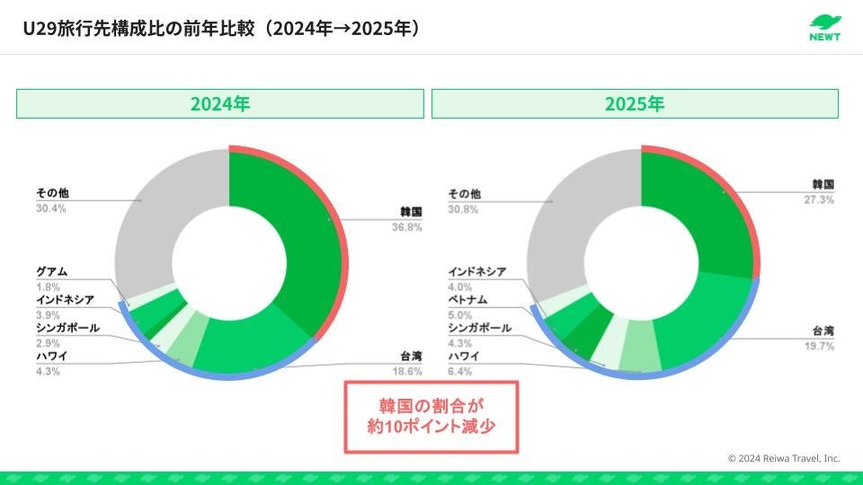 旅行アプリ『NEWT(ニュート)』は、2025年7月15日〜9月30日までのNEWTにおける予約データをもとに、U29世代における2025年夏休み海外旅行トレンドを発表しました。2025年の夏休みは、“韓国一強”だった海外旅行先の構図から変化し、ハワイ・シンガポール・ベトナムなどの割合が増加し、旅先の多様化が進んでいることが明らかになりました。