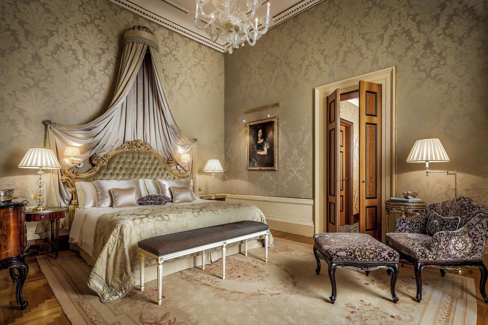 グリッティ パレス ラグジュアリー コレクションホテルの部屋には、アンティークの家具やベネチアの職人が作ったムラーノガラスのシャンデリアなど、貴重なアイテムが使用されています。大運河やサンタ・マリア・デル・ジッリョを眺められるお部屋もあります。