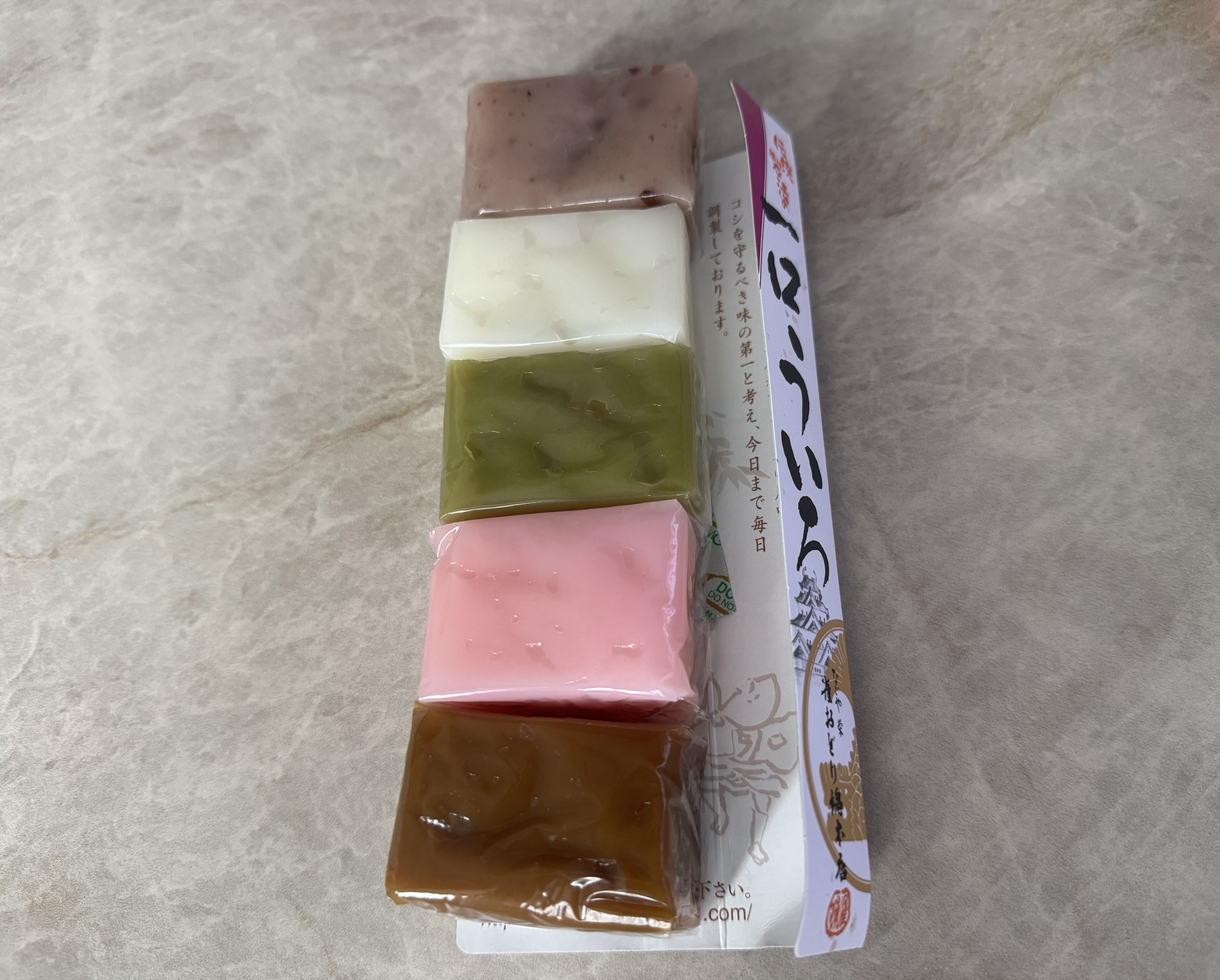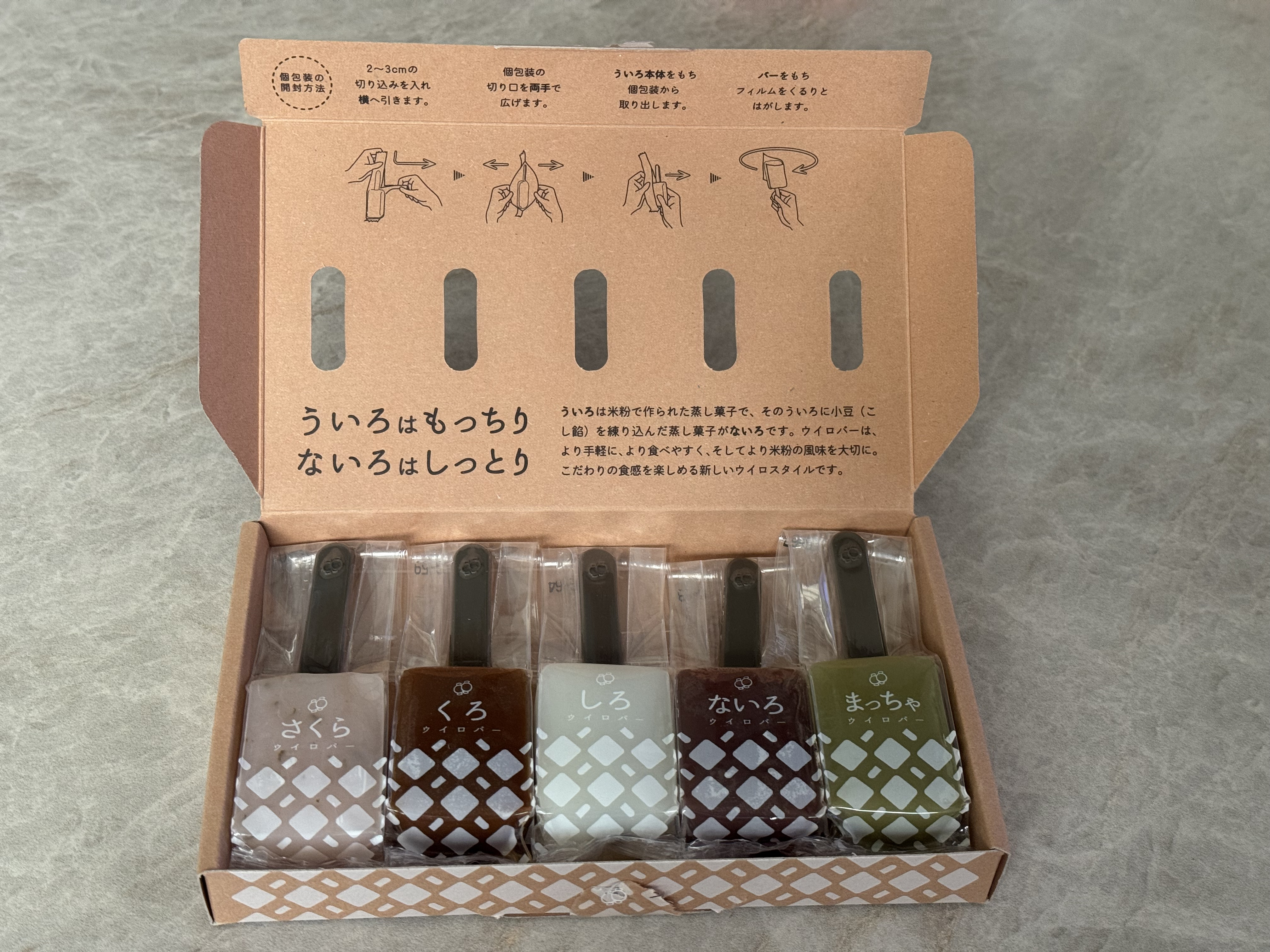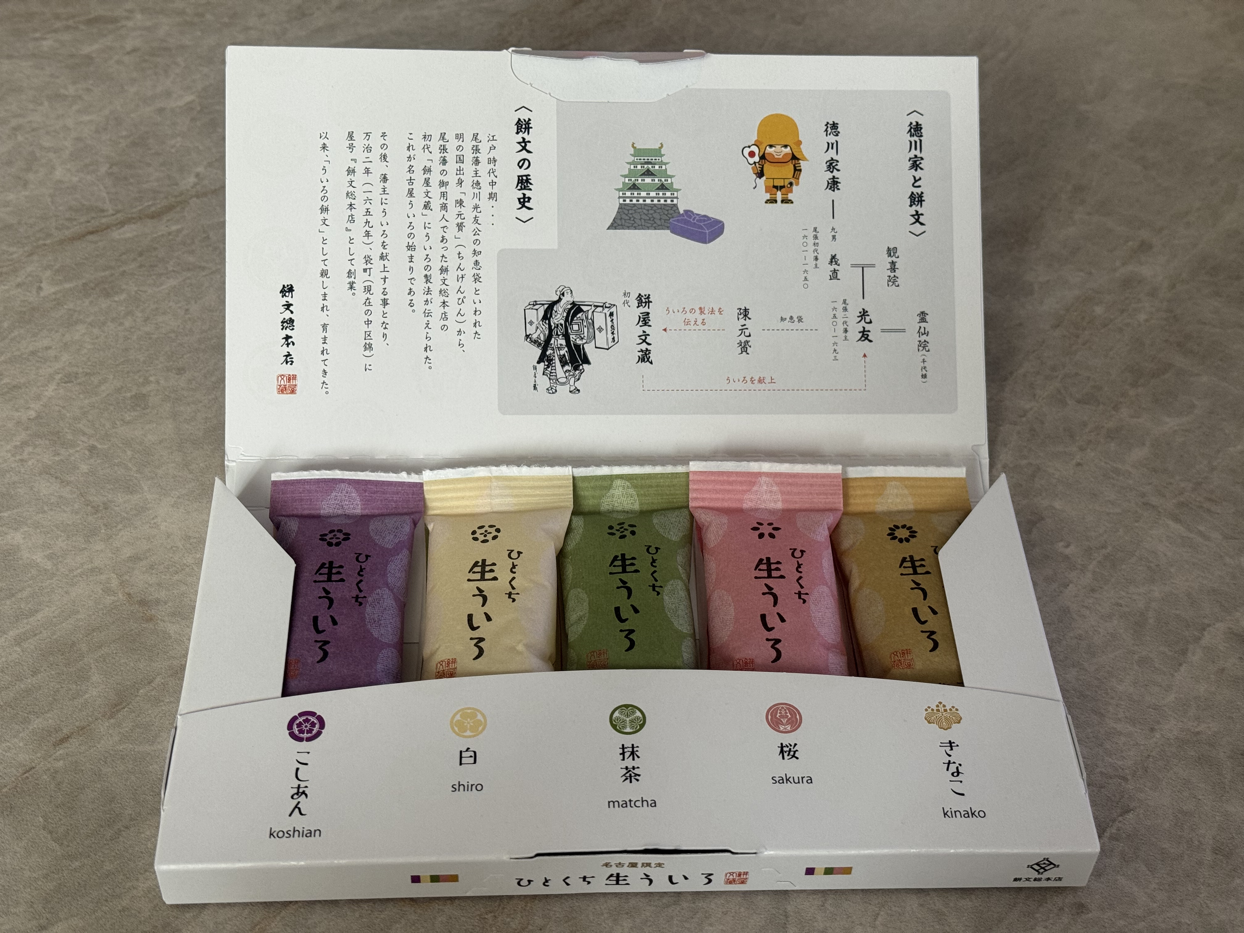 今回はお土産に最適な「ひとくち生ういろ」を実食しました。白・桜・こしあん・抹茶・きなこの5種類の味が楽しめます。