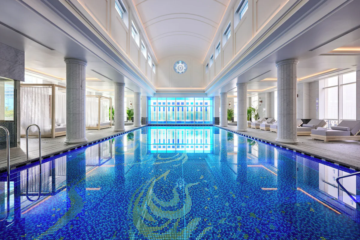 水面が窓外の緑とひと続きになるような、SNS映え必至の海外リゾート風空間が広がっています。インドアプールやジムで汗を流した後は、外資系ラグジュアリーホテルとしては温浴エリアで至福のバスタイムを過ごしましょう。
