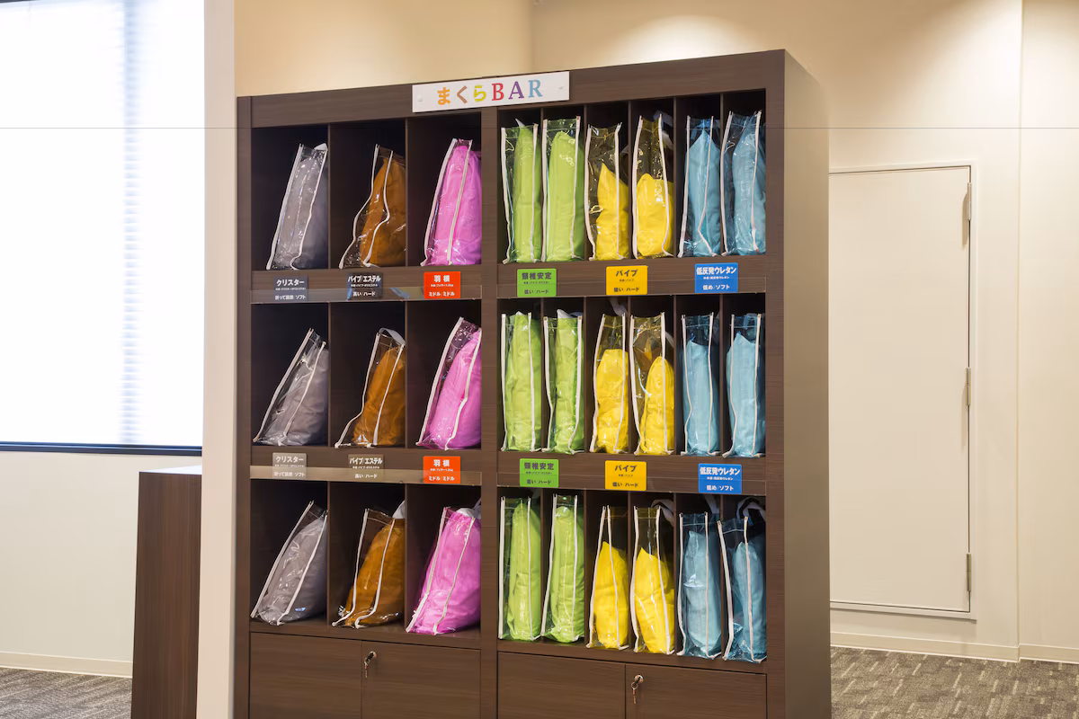 ロビーに設置された「まくらBAR」では、客室に備え付けの枕とは別に、高さや硬さ、素材の異なる多彩な枕から自分好みのものを選ぶことができます。