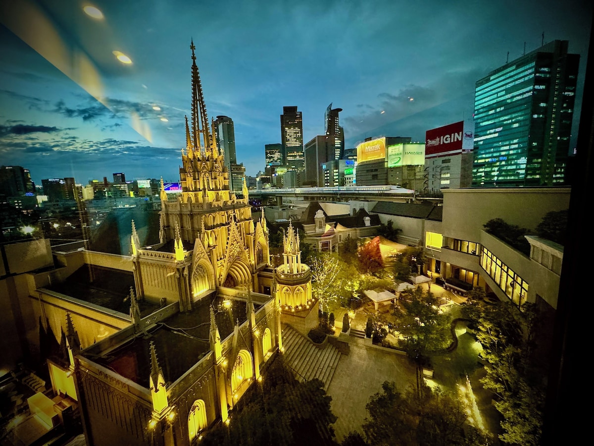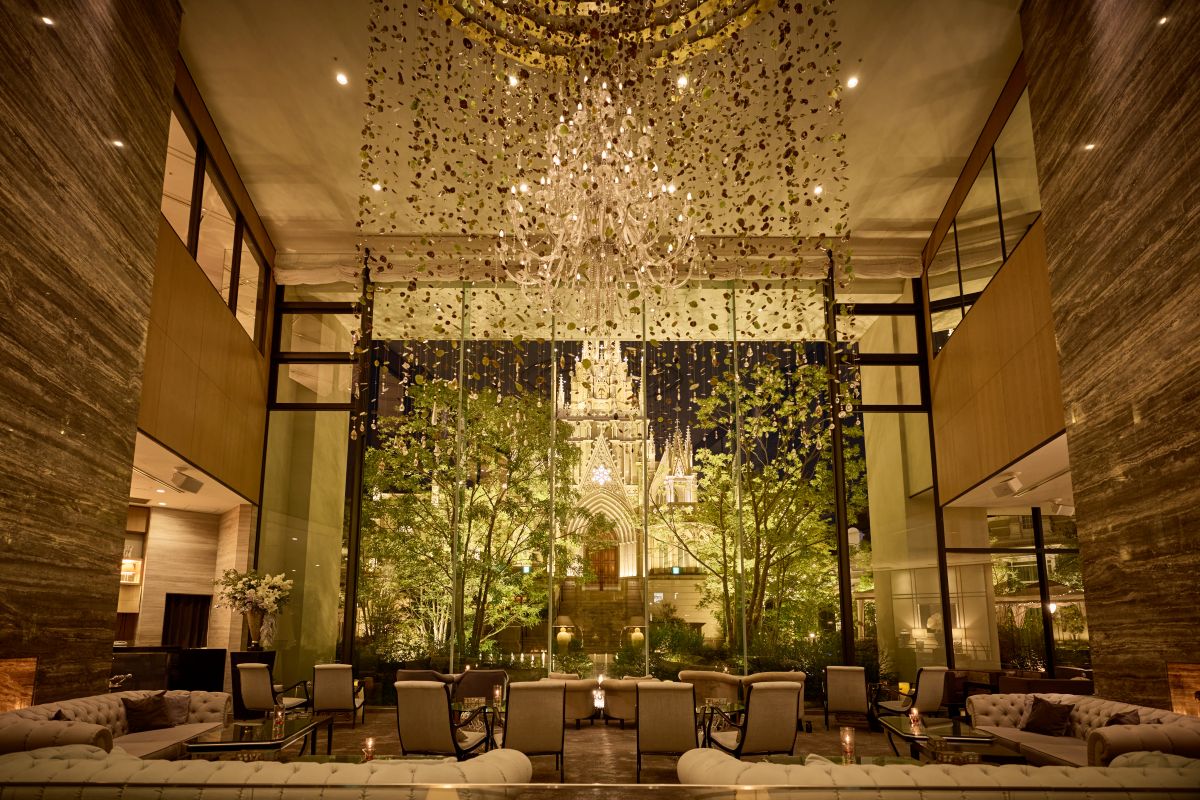ストリングスホテル 名古屋の見どころとして、真っ先に挙げられるのが、中庭に鎮座する「アートグレース大聖堂」です。名古屋駅という近代的なビル群が立ち並ぶエリアにありながら、一歩敷地内に踏み込めば、そこにはヨーロッパの古城のような壮麗な世界が広がっています。