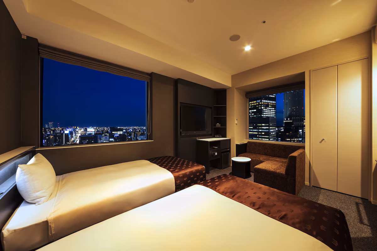 部屋タイプは、コンパクトながら機能的なスタンダードシングル(約15㎡〜)から、バス・トイレがセパレートになったプレミアムツインまで多彩。高層階ならではの眺望も魅力で、大パノラマで楽しむこともできます。