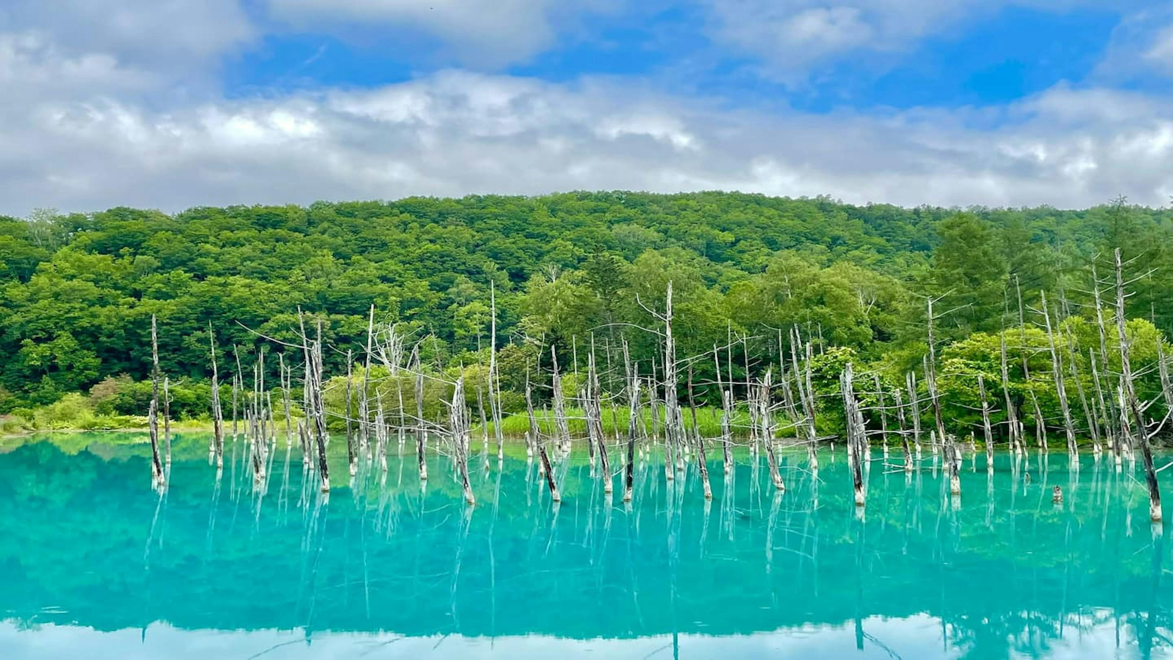 北海道・美瑛の人気観光スポット・青い池。コバルトブルーが美しい幻想的な絶景スポットで、国内外から観光客が訪れる北海道屈指の人気景勝地です。