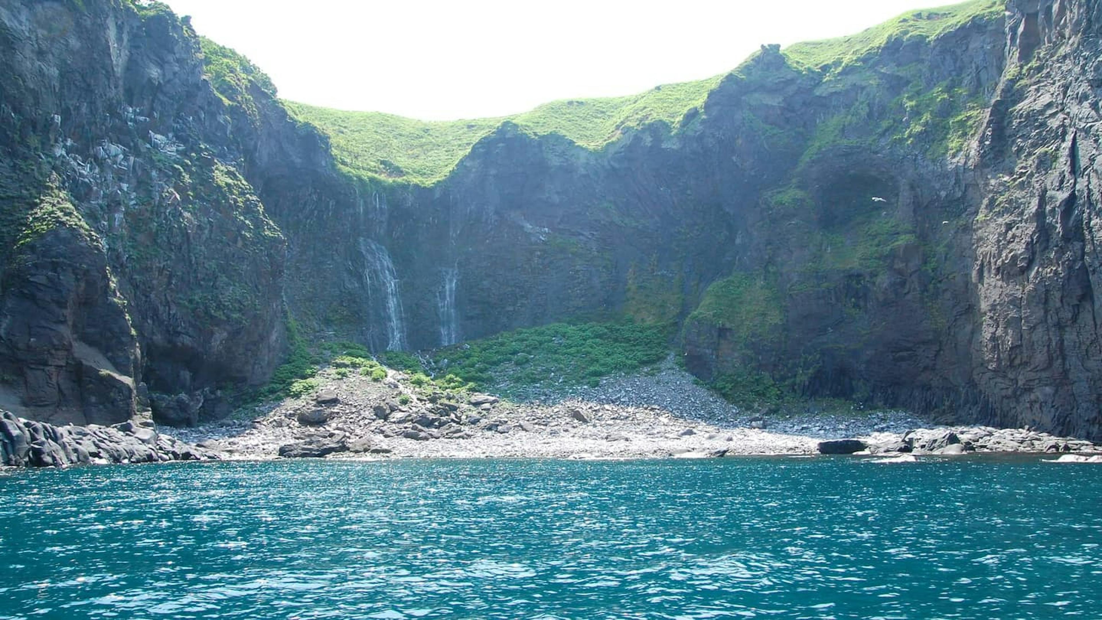 フレペの滝は、知床の山々から流れてきた地下水や雪解け水が断崖の途中で染み出し、そのままオホーツク海へと流れ落ちている滝。流れ込む川がないという点が特徴的な、珍しい滝です。年間を通して滝の水量が少ないため、涙のようにしとしとと流れ落ちる様子から「乙女の涙」とも呼ばれています。