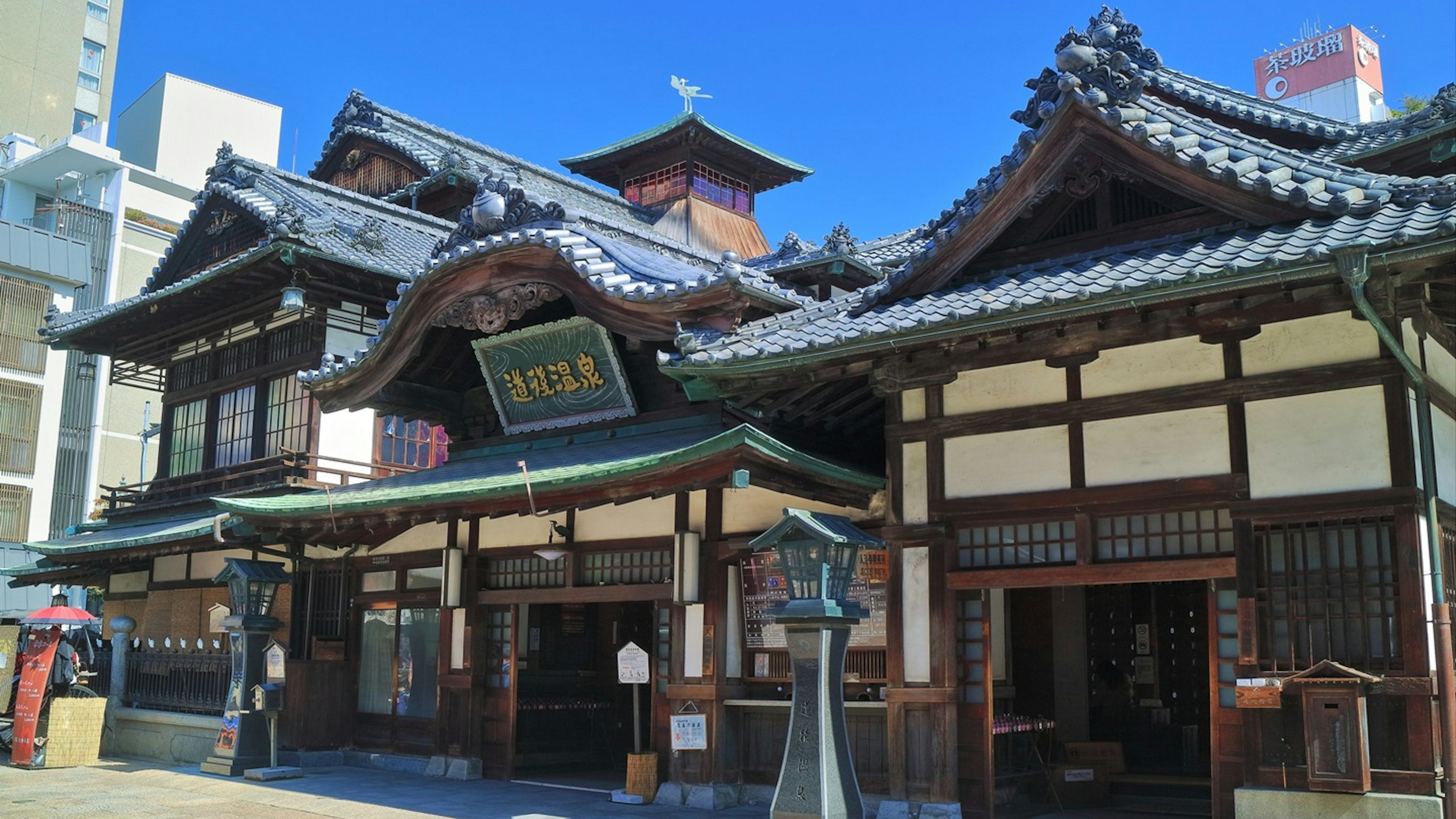 道後温泉駅に到着したら、温泉本館まではわずか徒歩4分ほどです。駅舎を出て左手に進むと、すぐに道後温泉のシンボルである時計台が見えてきますよ。約300mで道後温泉本館に到着します。