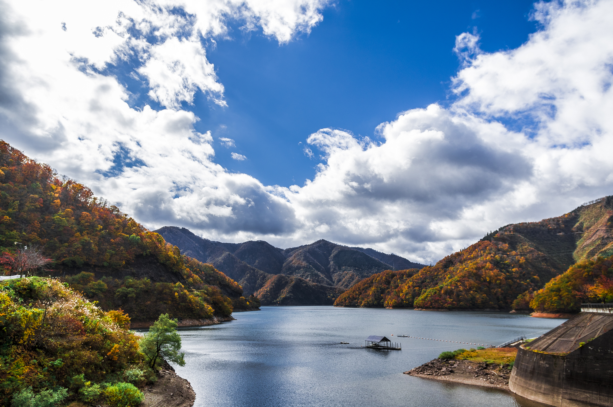 湖畔を走る国道158号沿いには湖を見下ろすビュースポットが点在し、新緑や雪景色など四季折々の景観が楽しめ、特に紅葉シーズンには色づいた山々と湖面のコントラストが美しいことで知られています。