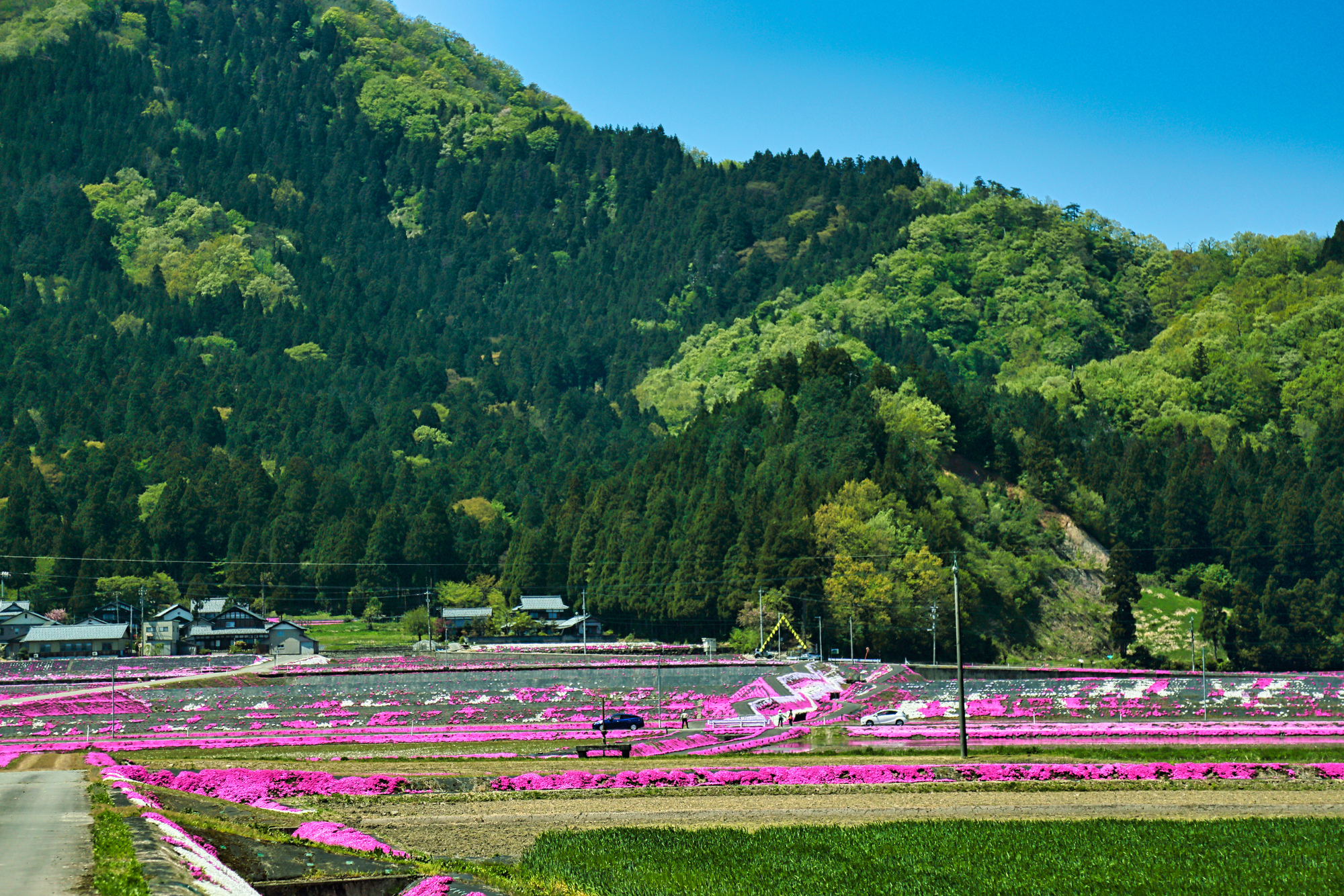 ピンクや白のシバザクラと、のどかな里山・田園風景とのコントラストが美しく、見頃の4月下旬〜5月上旬には写真撮影を楽しむ人も多く訪れます。