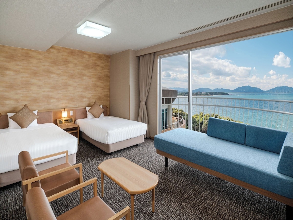 入室した瞬間に目に飛び込むのは、窓一面に広がる青い海。ホテルの最大の魅力は、全室がオーシャンビューであることです。記念日には、リブランドで新設された和洋室がおすすめ。
