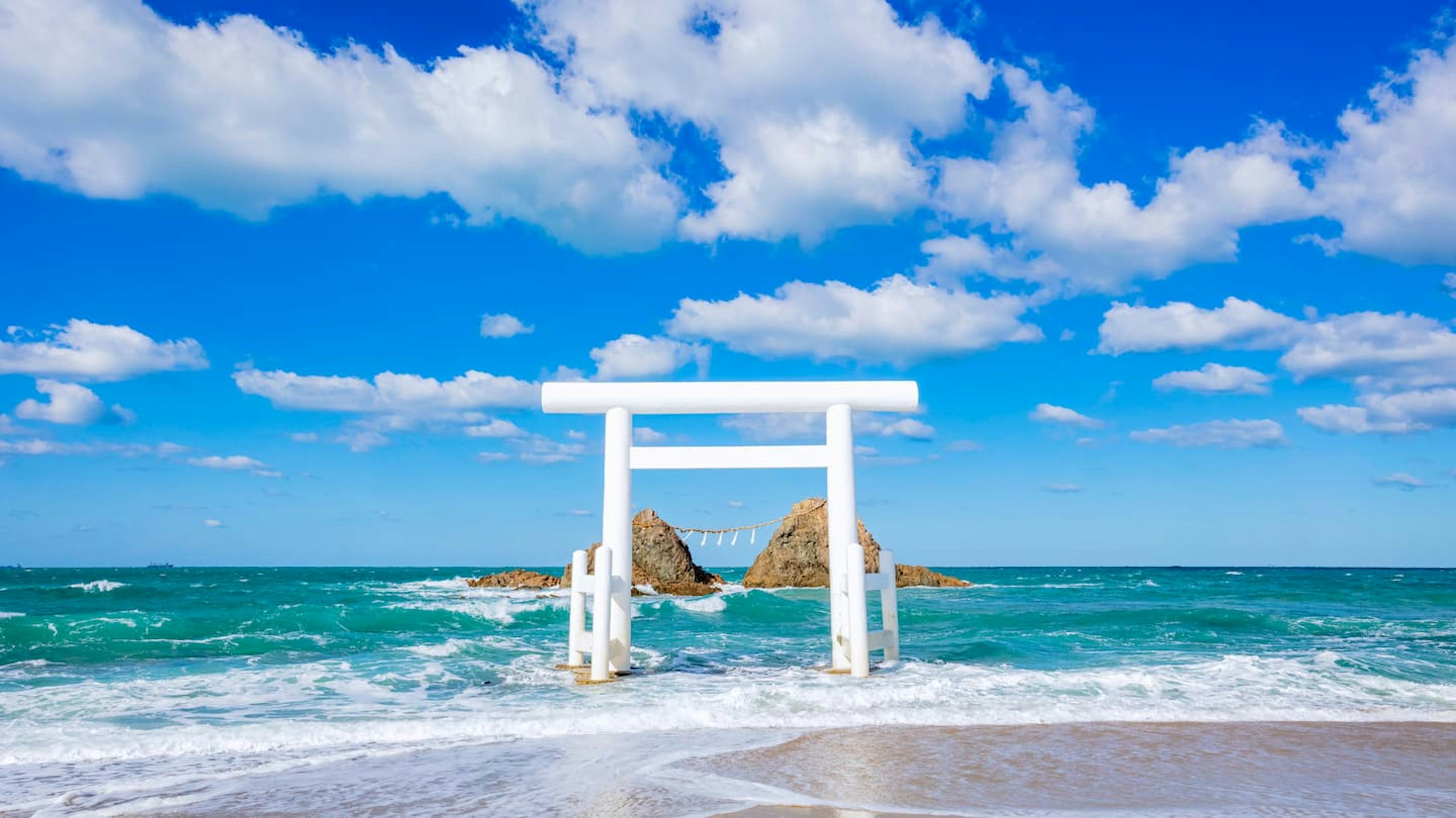 糸島デートの始まりは、定番の「夫婦岩(桜井二見ヶ浦)」から!美しい鳥居と夫婦岩を背景に、カップルで素敵な写真を撮りましょう。