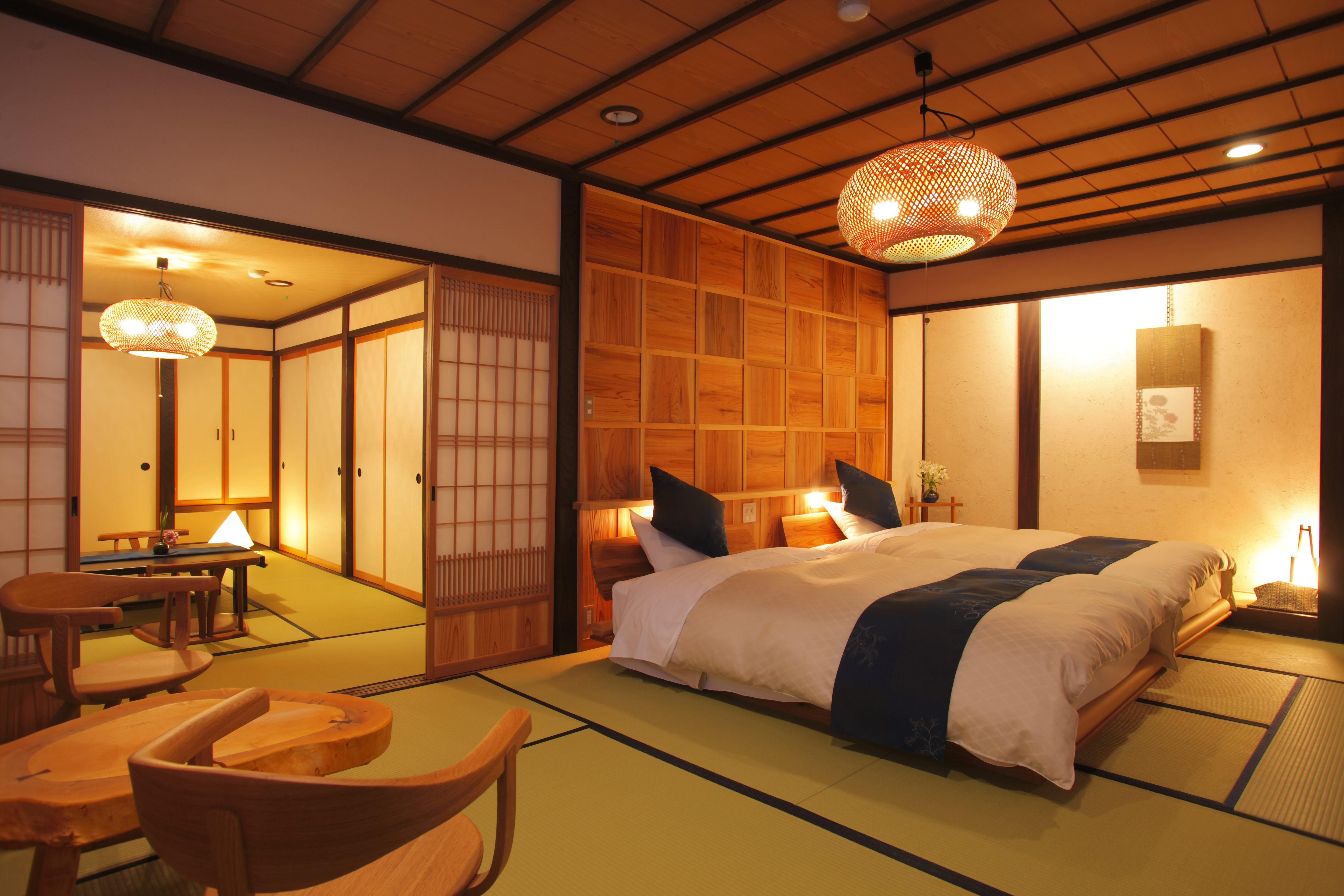 二間続きスーペリア | 和室・二間続き(16〜20畳) | 2〜5名 | 露天風呂なしだが、広々とした空間と飛騨家具メーカーが手掛けたベッドが魅力。 |