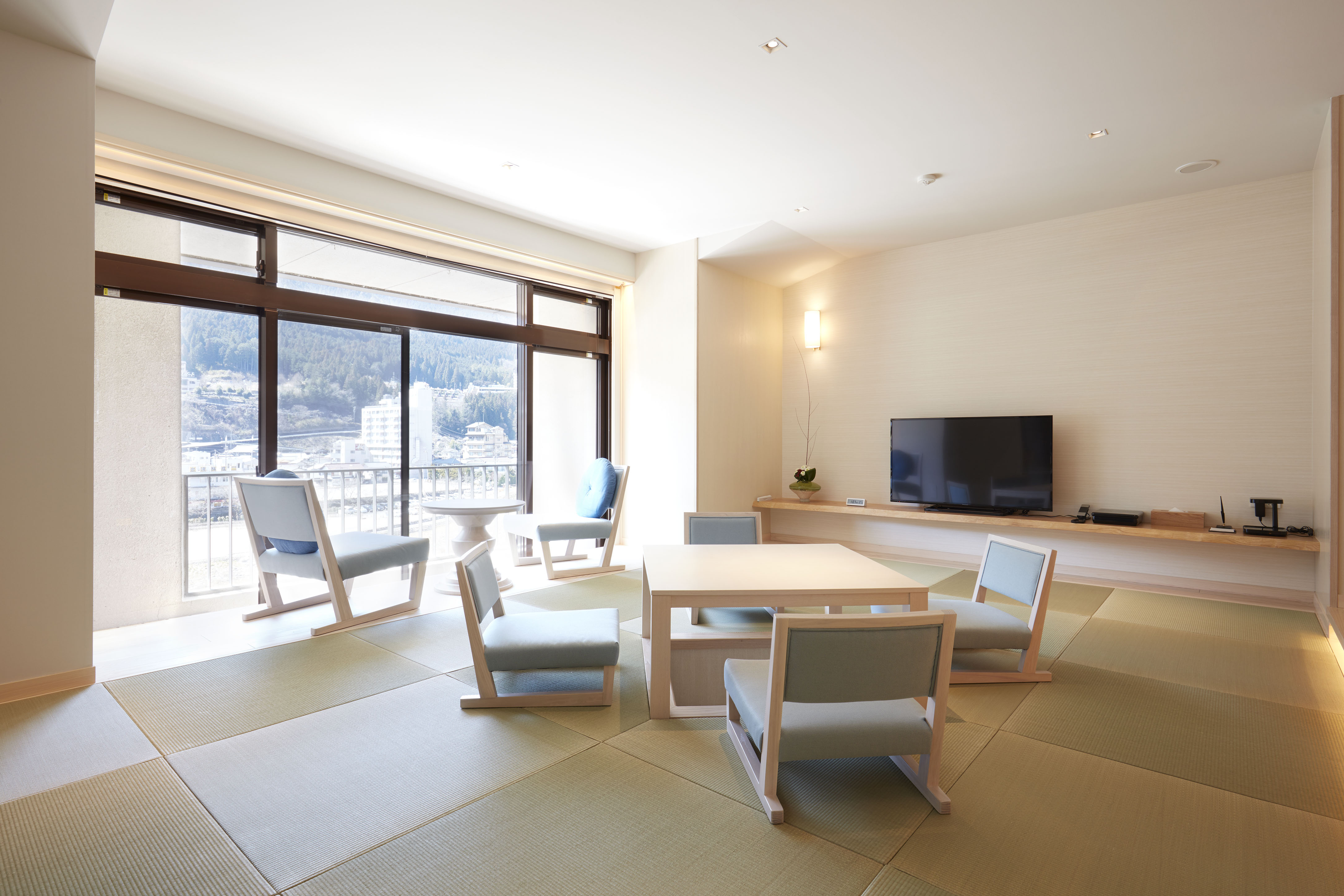 2016年7月にオープンした別館「ゆらぎ」。和モダンの温かく快適な空間設計で、各客室に備えられた開放的なバルコニーからは、眼前に流れる飛騨川と雄大な山々の眺望が楽しめる人気の客室タイプです。