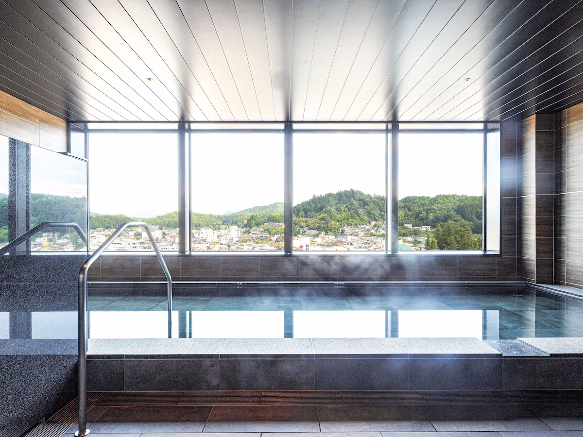 まず特筆すべきは、天然温泉である「飛騨高山温泉」を引いた展望大浴場です。湯船に身を沈めると、目の前には飛騨高山のノスタルジックな街並みと、遠くに連なる雄大な山々の絶景が広がります。