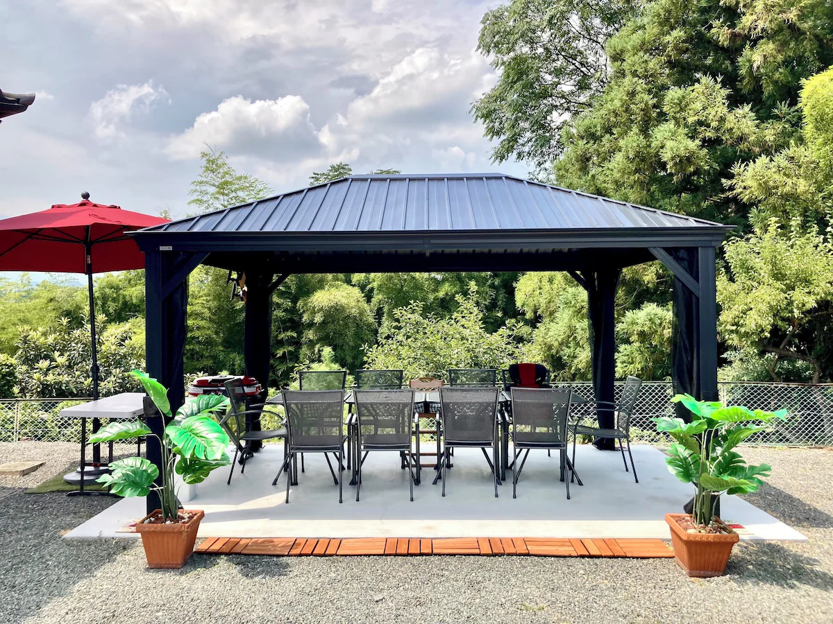 開放感ばつぐんの庭には屋根つきのテラスがあり、雨の日でも安心してバーベキューが楽しめます。ガスバーベキュー機材は無料で貸し出されているので、ワンクリックで火がつくのも準備や片付けが簡単でうれしいポイント!