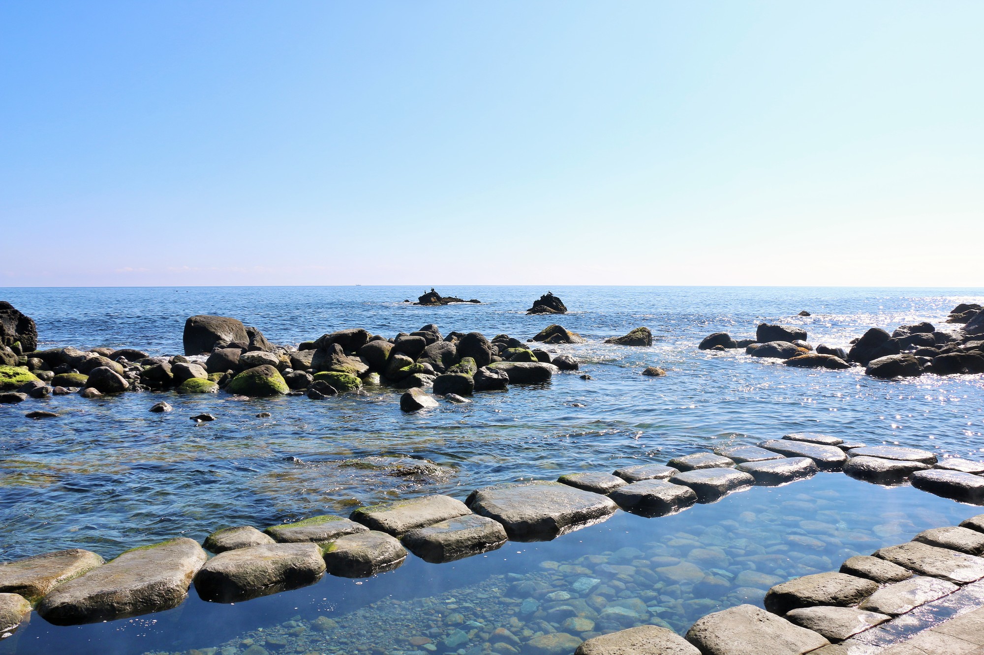 恵山火山を熱源とする源泉はおおむね40〜65度と幅があり、海水と混ざることで程よい湯加減になります。施設は、函館市が管理する無料の野趣あふれる混浴露天です。