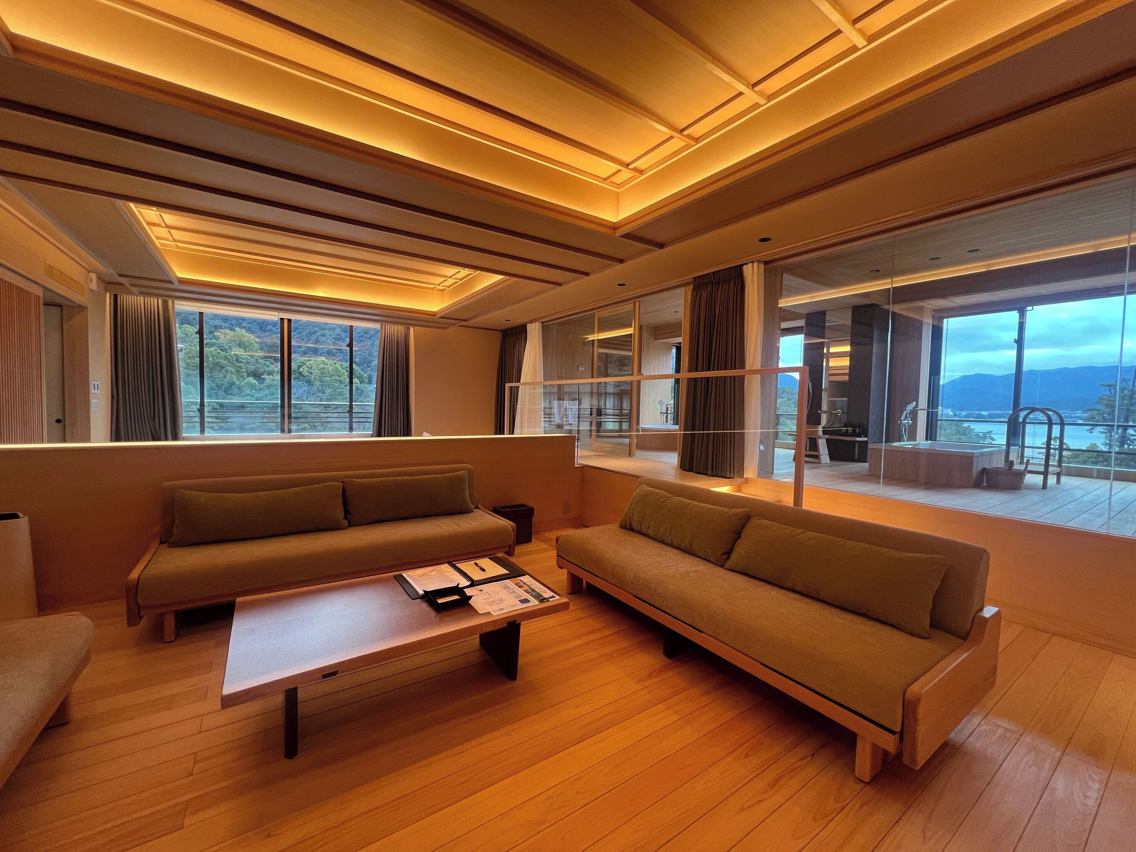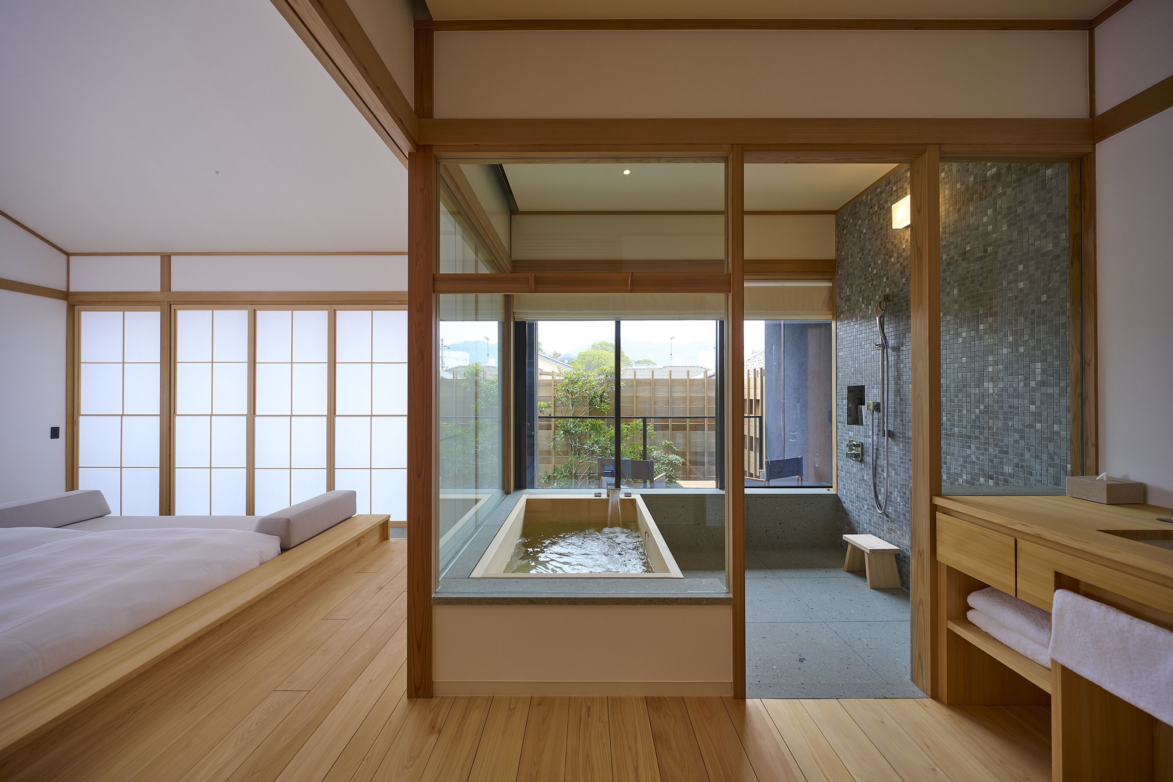 中庭に沿った二階建ての建物につくられた客室は、杉、檜、福光石などの天然素材を活かし、数寄屋造りの趣を取り入れたつくり。伝統的な旅館のくつろぎと現代的な設えを融合させた部屋で、家にいるようにリラックスしながらぜいたくなひとときを過ごせます。