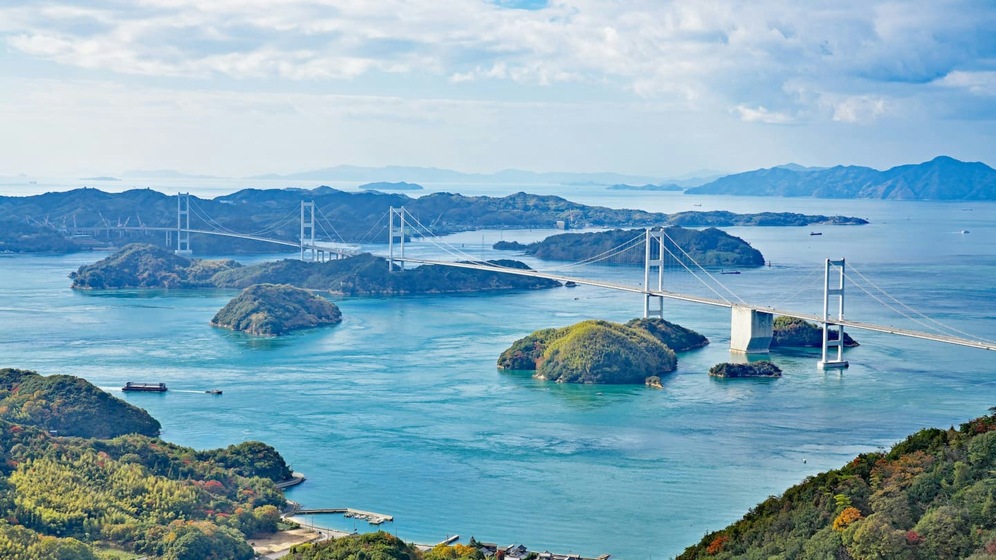 しまなみ海道は、広島県尾道市から愛媛県今治市までを結ぶ全長約60キロメートルの海上路です。7つの橋で6つの島々を繋ぎ、うつくしい瀬戸内海の景色を楽しめる人気のサイクリングコースとしても知られています。