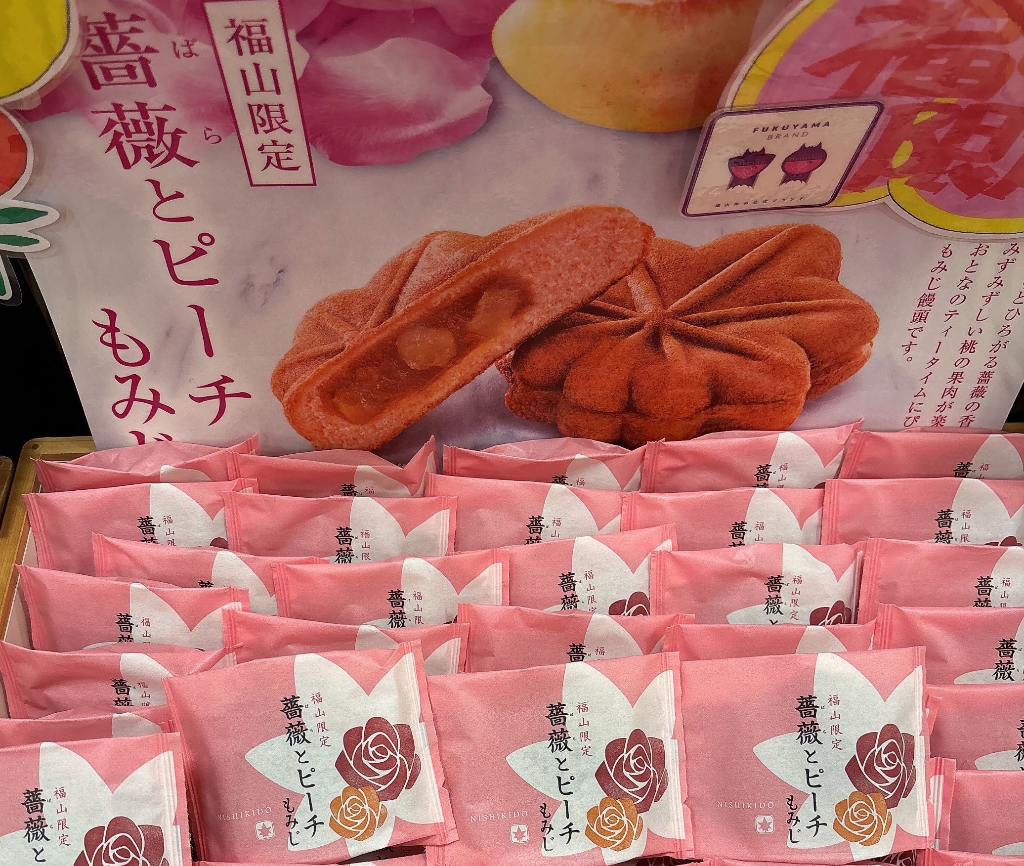 薔薇とピーチもみじは、にしき堂のオンラインショップでも買えない、超レアなもみじ饅頭。福山でも限られた直営店でしか購入できないので、福山だけで販売されているお土産になります。
