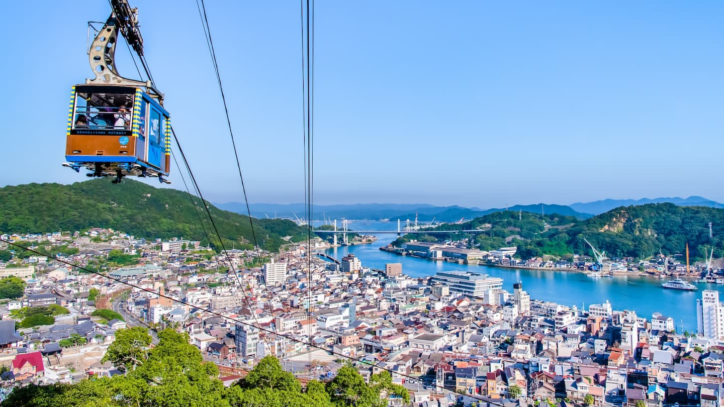 千光寺ロープウェイは、尾道水道と尾道・瀬戸内の風景を楽しみながら3分間で千光寺公園にアクセスできるロープウェイ。神社とお寺の上を通過する珍しいロープウェイとしても人気です。