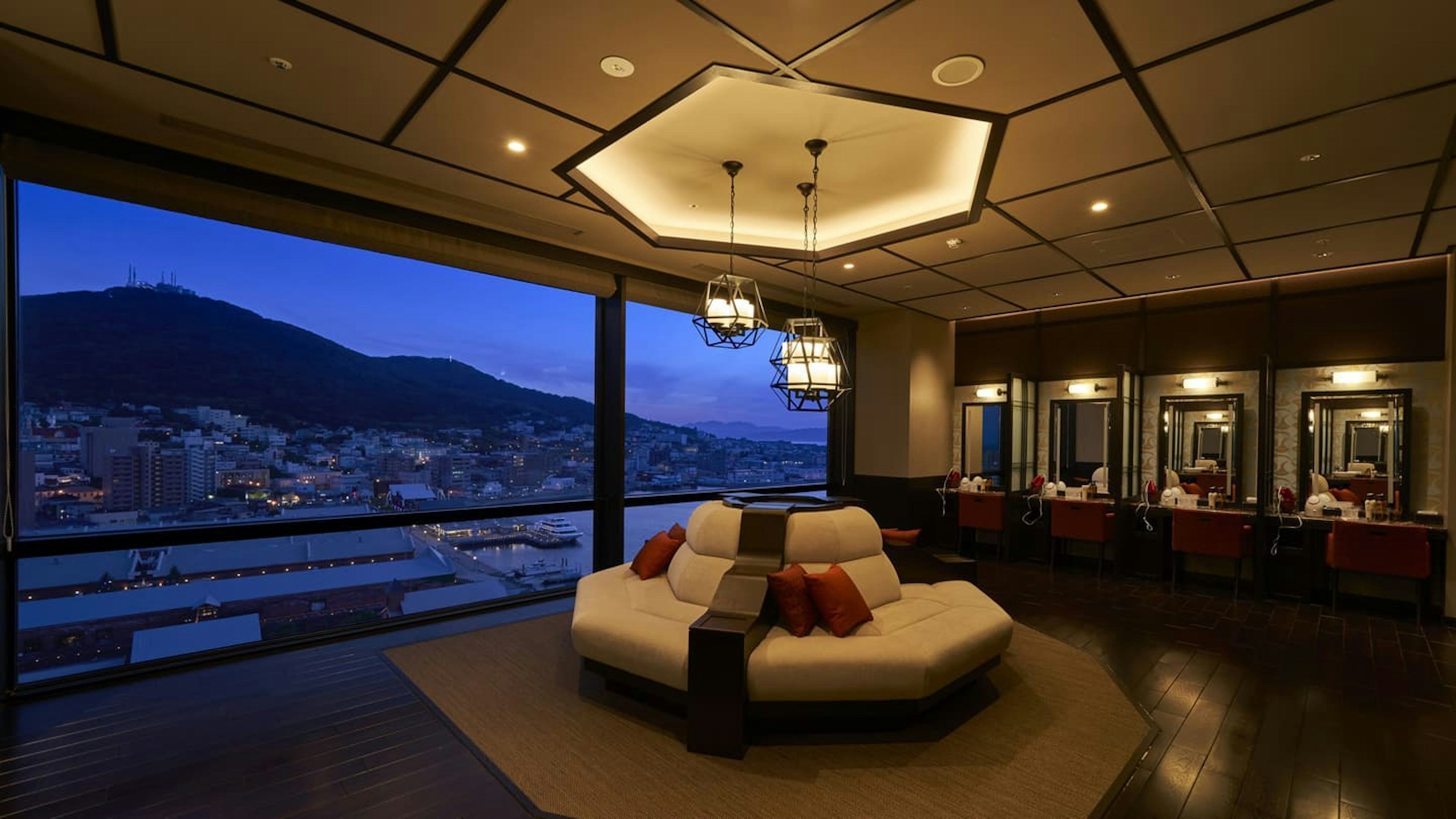 また、座ったりベッドに横になったりしても景色が見やすいよう低く設計された大きな窓からは、函館の美しい夜景を一望することができ、ロマンチックなひとときを過ごすことができます。