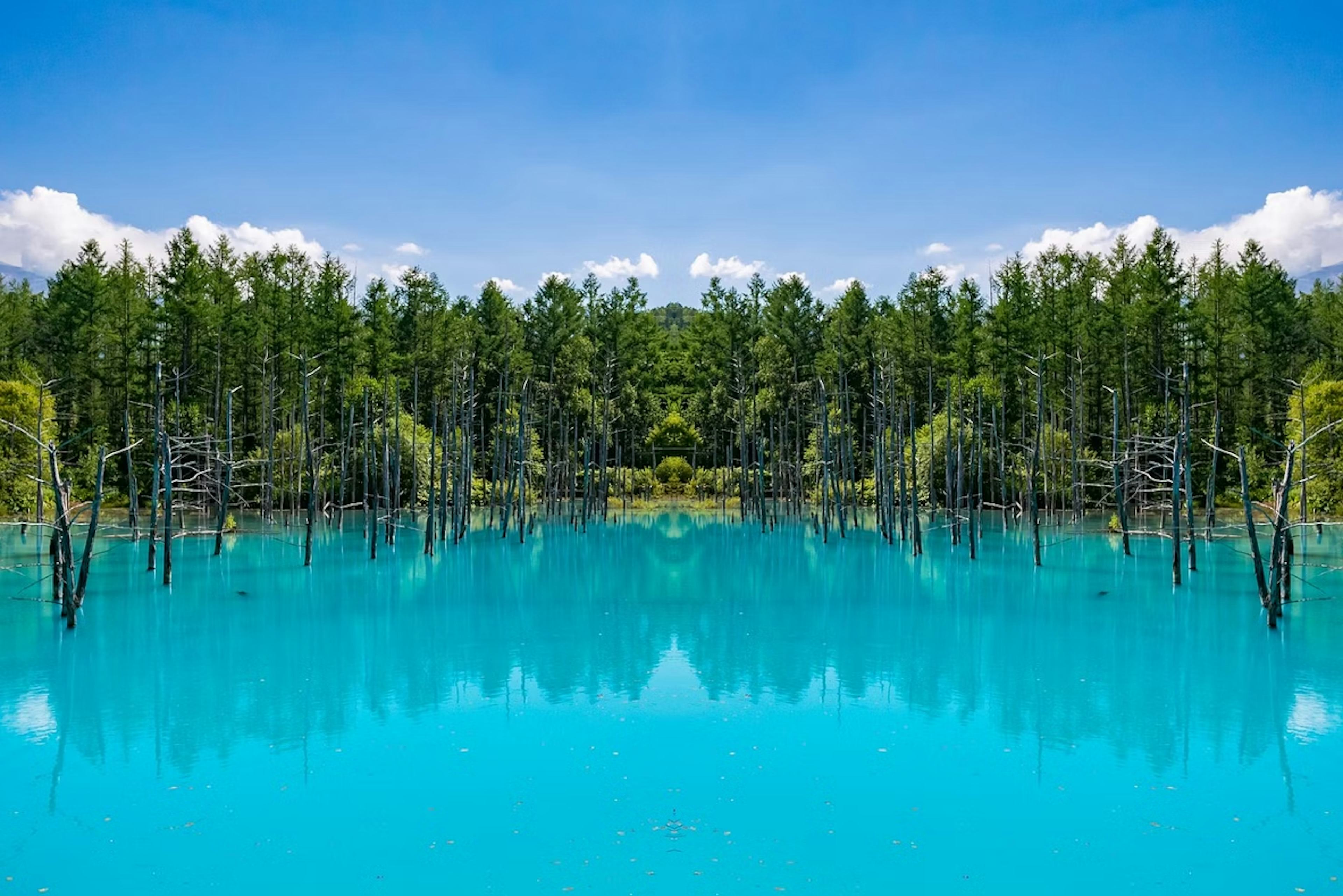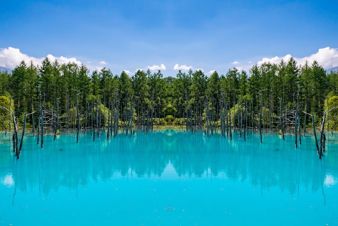 美瑛の青い池は、ブルーの幻想的な風景が人気のスポット!季節や天候によって異なるブルーの水面が作り出され、どれも神秘的です。
