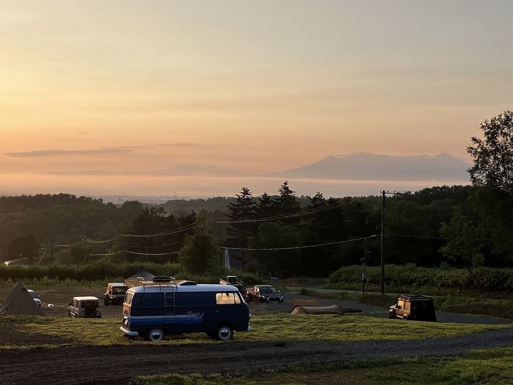 北海道・旭川市の高台に広がる「THE FIRST BASE アウトドアフィールド」は、街並みと山並みの両方を望めるロケーションが魅力のキャンプ&アウトドアスポットです。場内からは旭川市街の夜景や、大雪山・旭岳を望む景色が広がり、街から車で約15分とは思えない静けさの中で、日常の喧騒を忘れさせてくれる穏やかな時間が流れています。