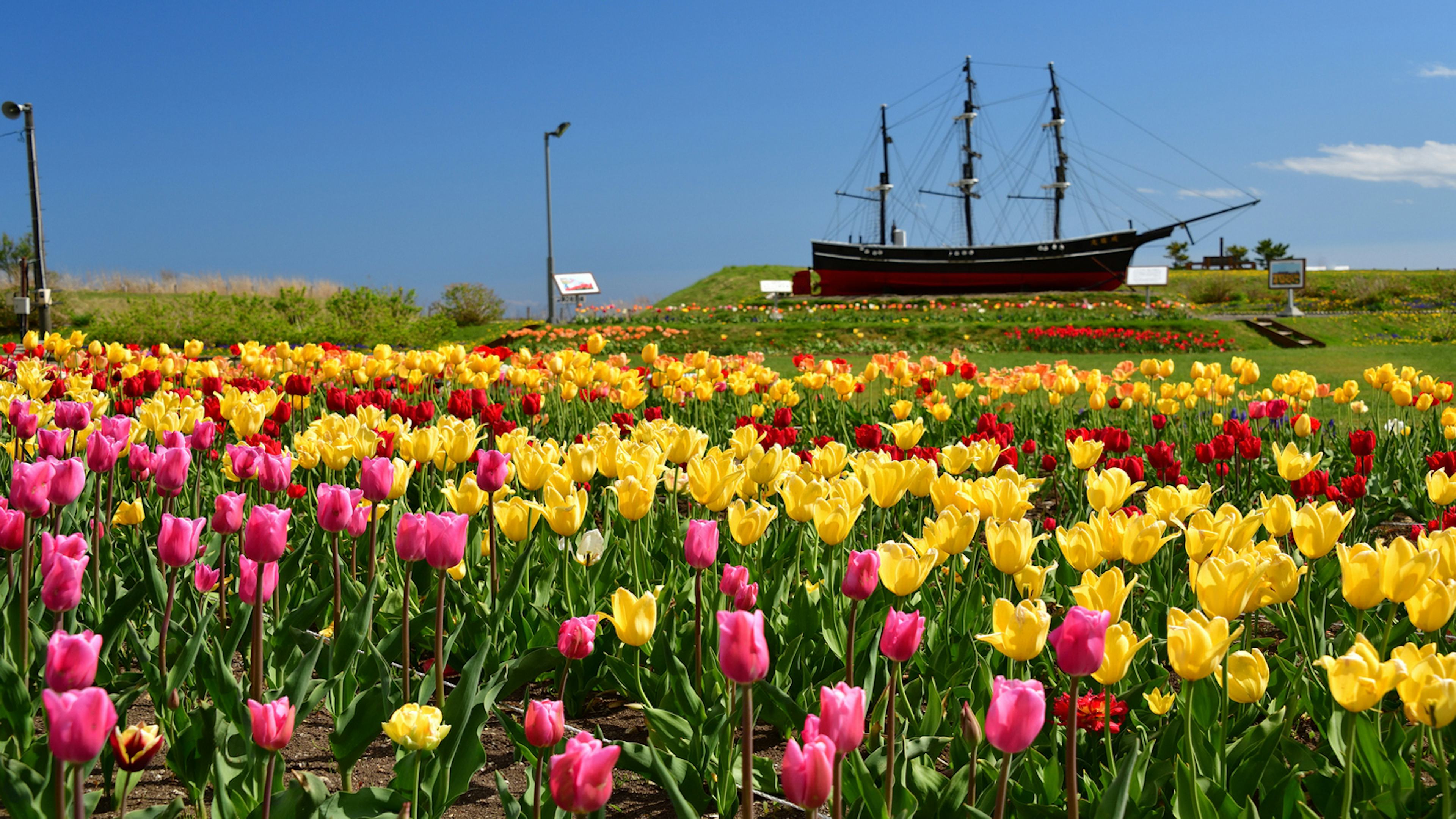 伝説の船が眠る海に、色とりどりのチューリップが咲き誇る