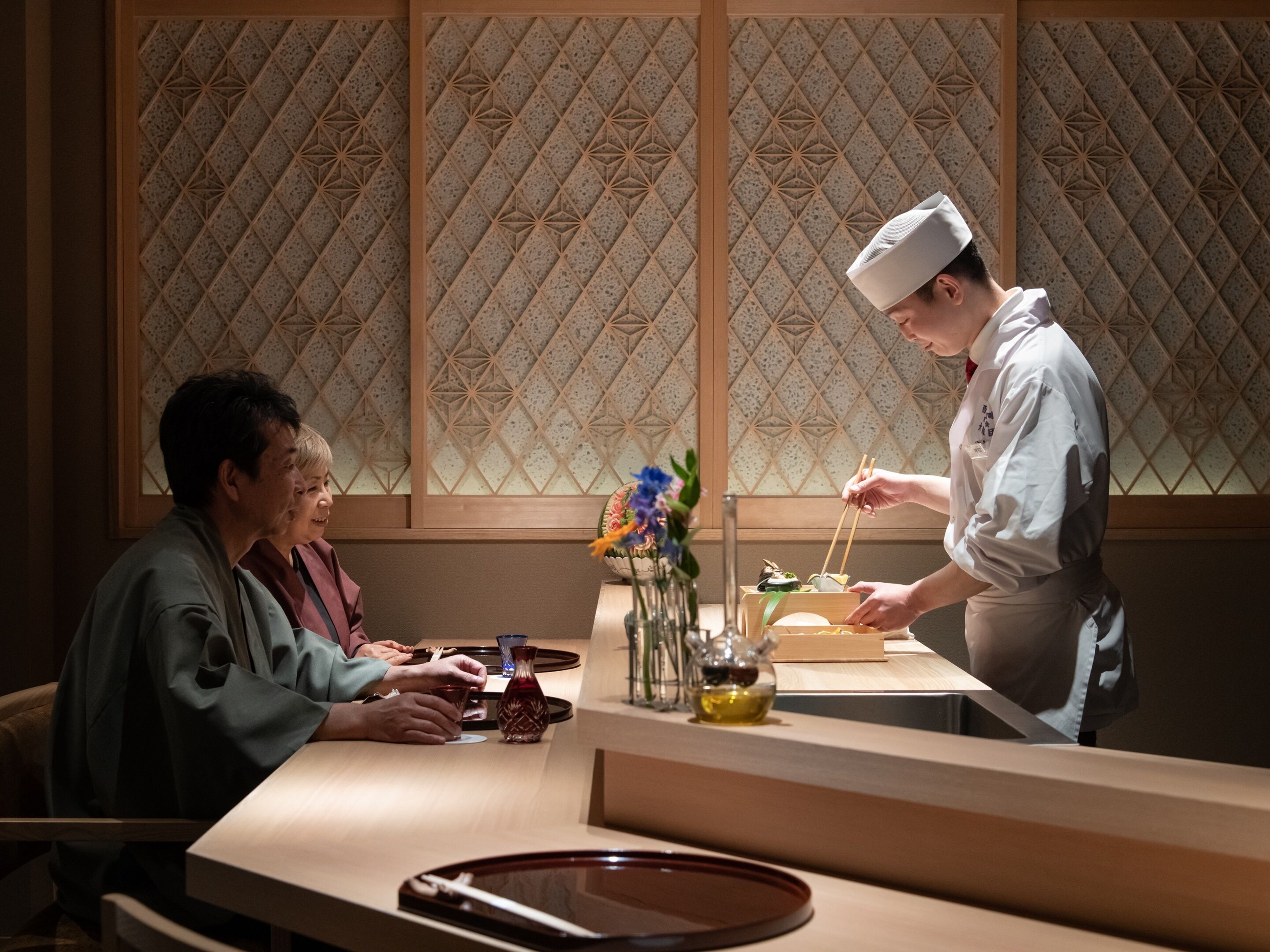 料理の宿としても親しまれており、レストランは割烹カウンターが中心。客前料理というスタイルを採用しており、板前が目の前で調理しながら食材や調理法を説明してくれます。