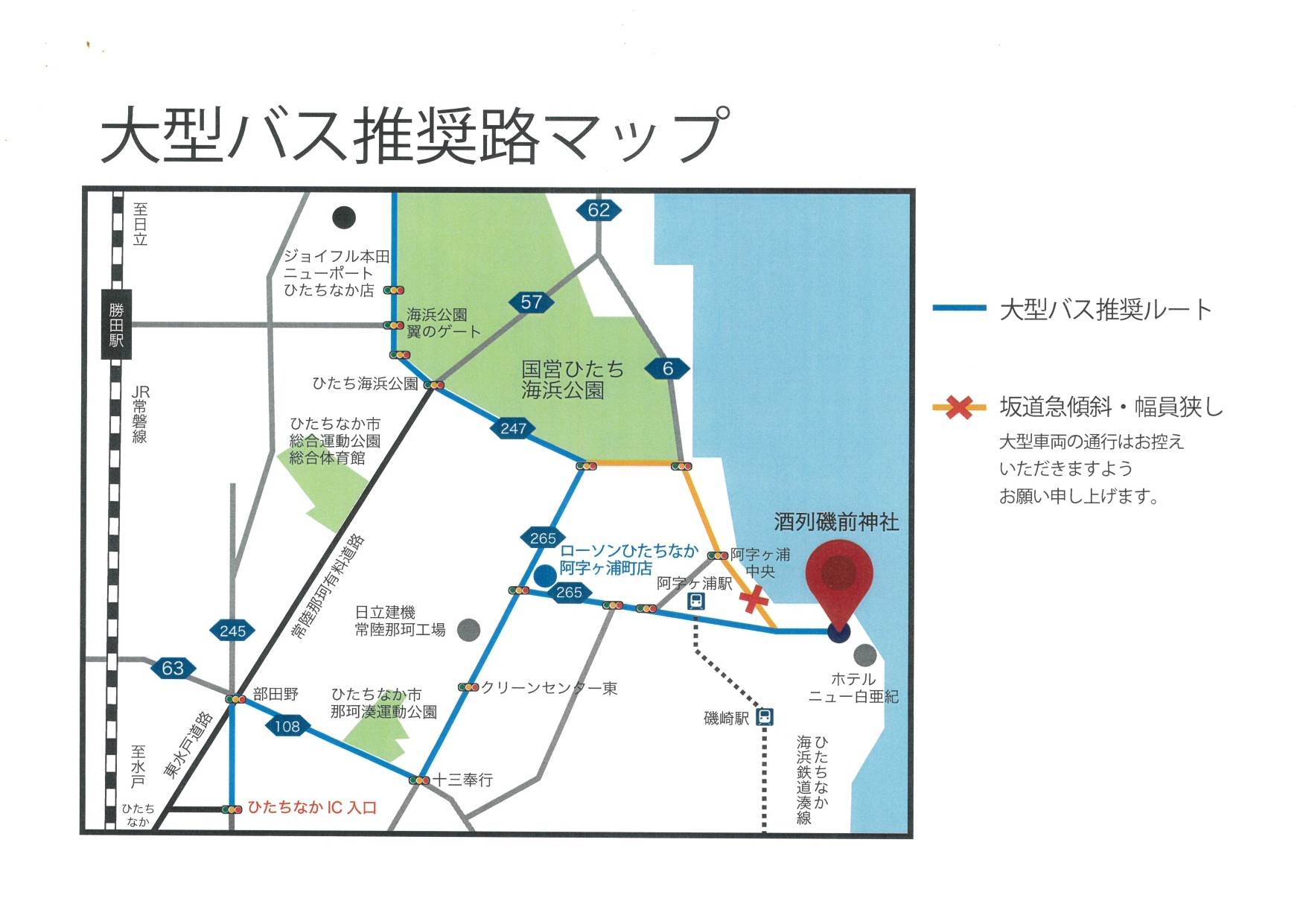 電車を利用する場合は、JR常磐線の勝田駅で「ひたちなか海浜鉄道湊線」に乗り換えます。ローカル線ののどかな風景を楽しみながら、「磯崎駅」もしくは終点の「阿字ヶ浦駅」で下車し、そこから徒歩10分ほどで神社に到着します。駅から神社までの道は平坦で歩きやすいです。