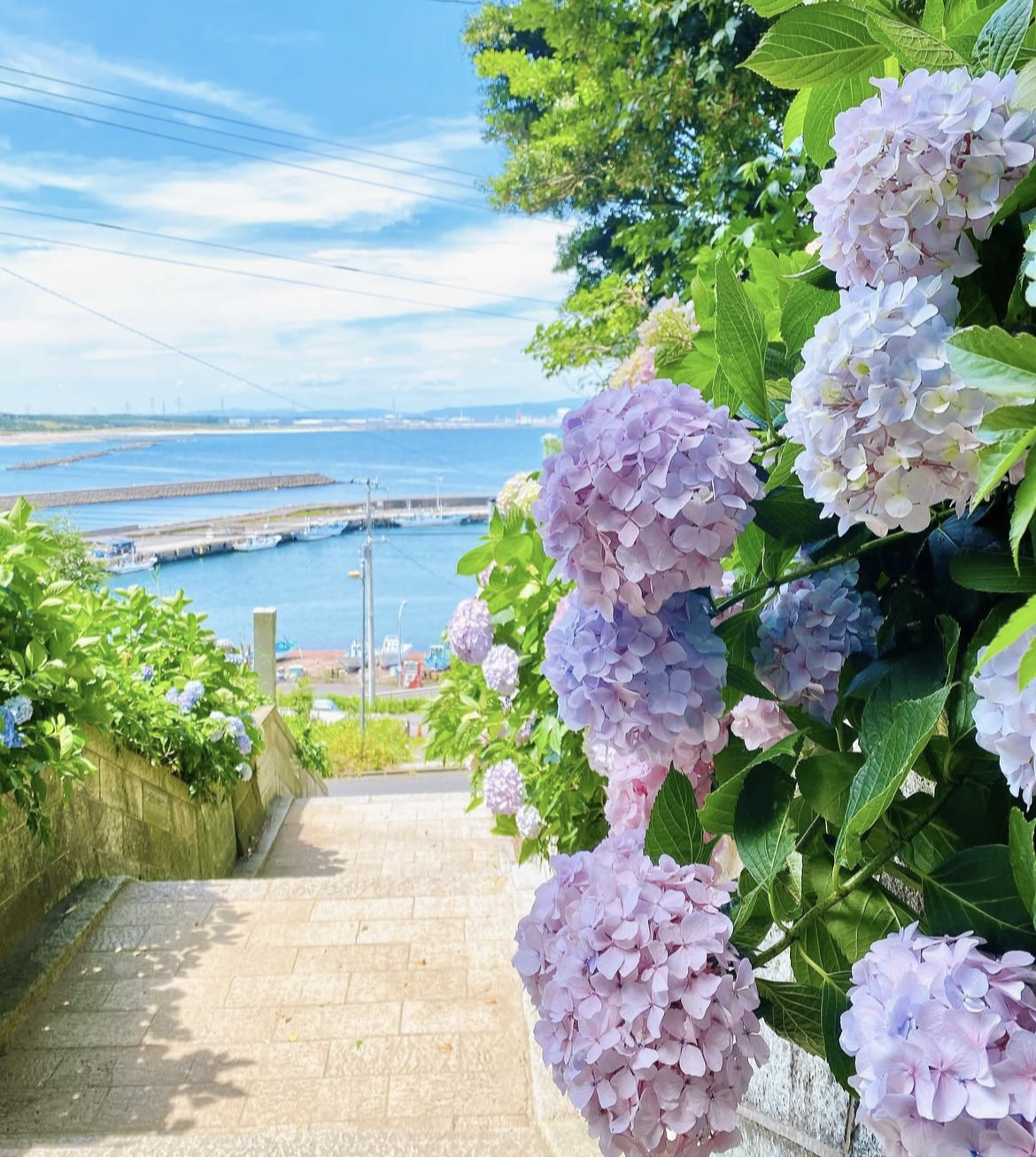 また、6月中旬〜7月上旬にかけては、海の見える鳥居の周辺に色鮮やかな紫陽花が咲きほこります。青やピンクの花が山道の両脇に咲く光景は、青い海とのコントラストも相まって、とてもうつくしいです。
