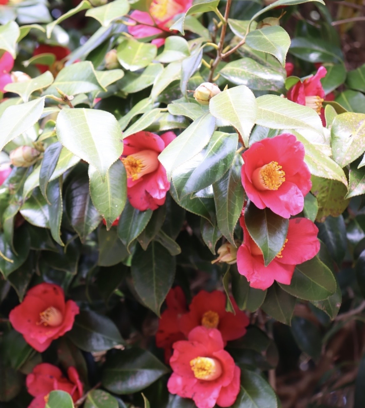 木々がアーチ状に枝を伸ばす様子は、まさに緑のトンネルのよう。2~3月にかけては、ツバキの赤い花が咲き誇ります。木漏れ日が差し込む静かな道を歩くだけで、心が癒やされるのを感じられます。