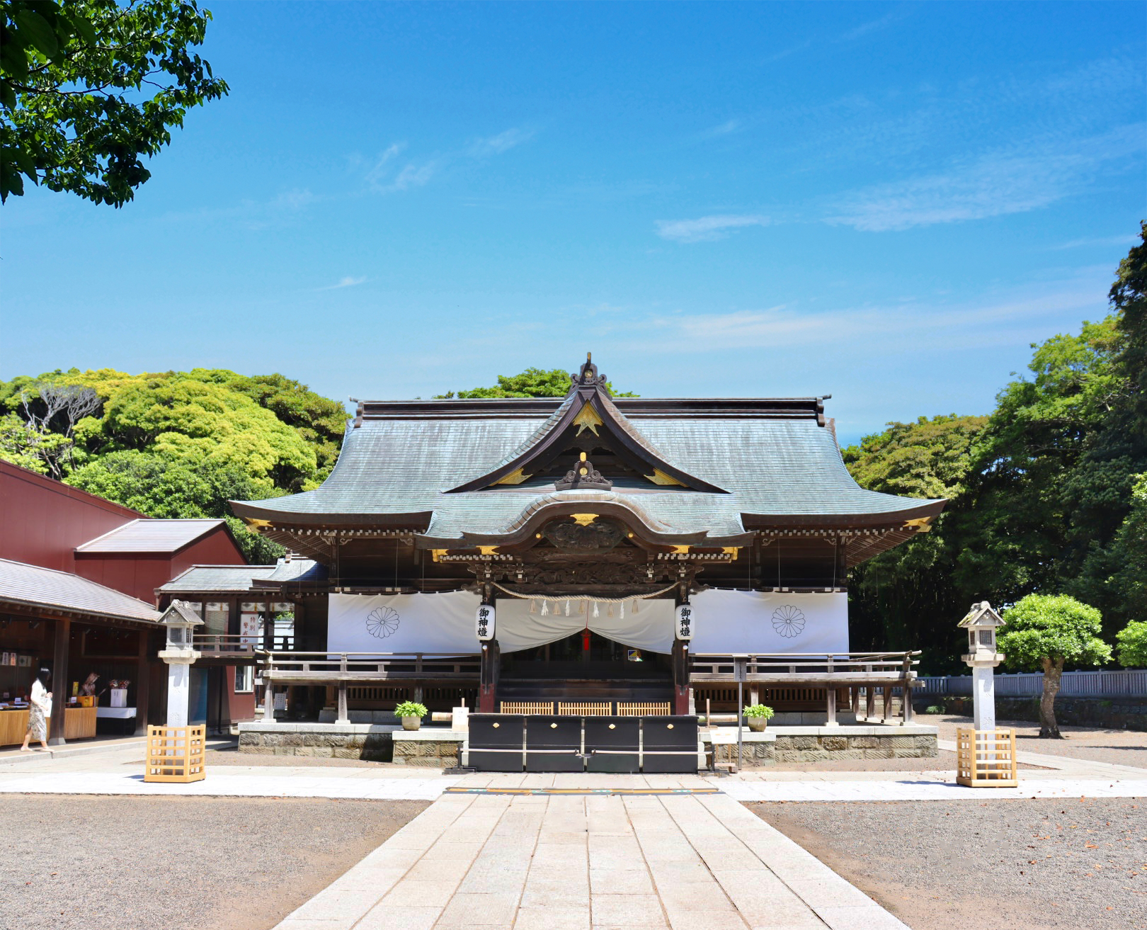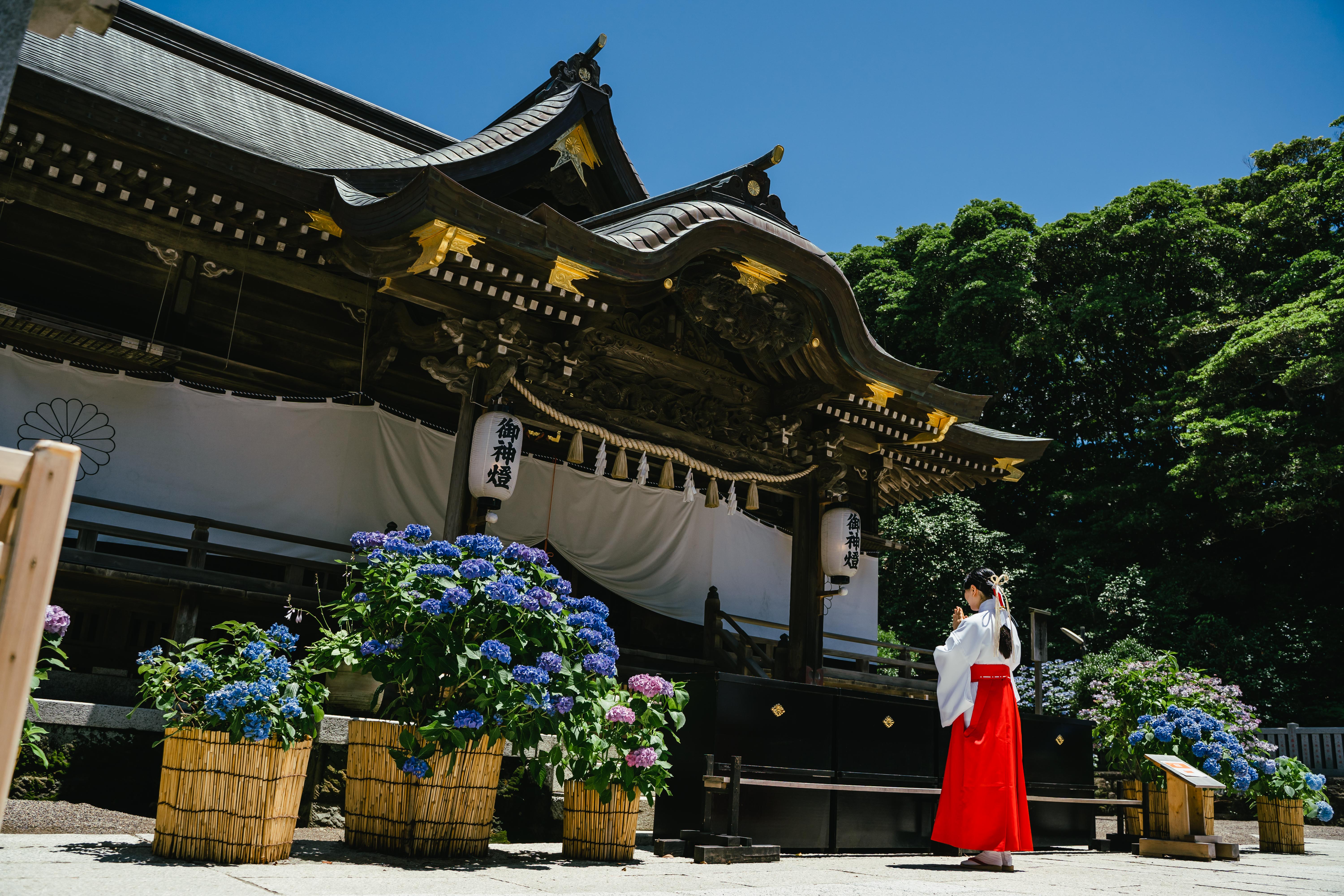さらに、社殿へ向かって参道を進むと、左手に「海の見える鳥居」が現れます。鳥居の向こうに太平洋が広がり、弧を描く海岸線を楽しめる景色は、絶好のフォトスポットです。6~7月にかけては、アジサイの花が鳥居両脇に咲きほこります。
