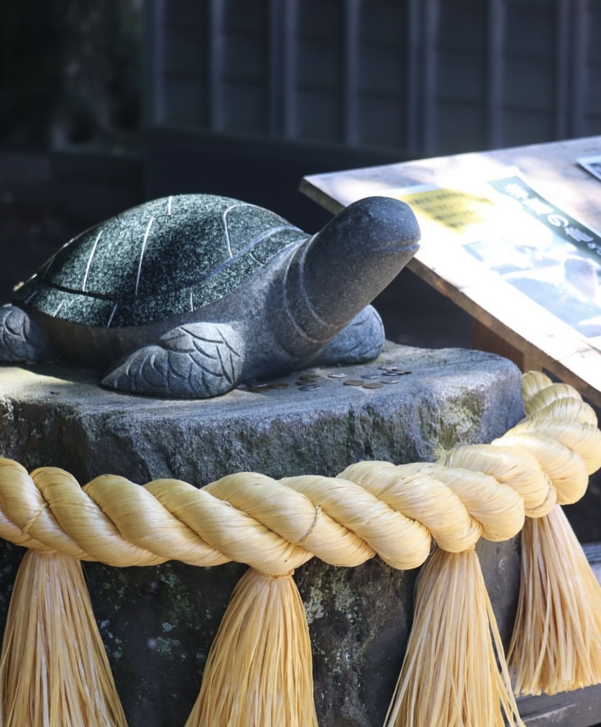 参道の鳥居をくぐった先にいる「幸運の亀さん」の石像は、酒列磯前神社でもっとも人気のあるスポットのひとつです。この像は、宝くじで高額当選を果たした参拝者が、感謝の気持ちを込めて奉納したもの。