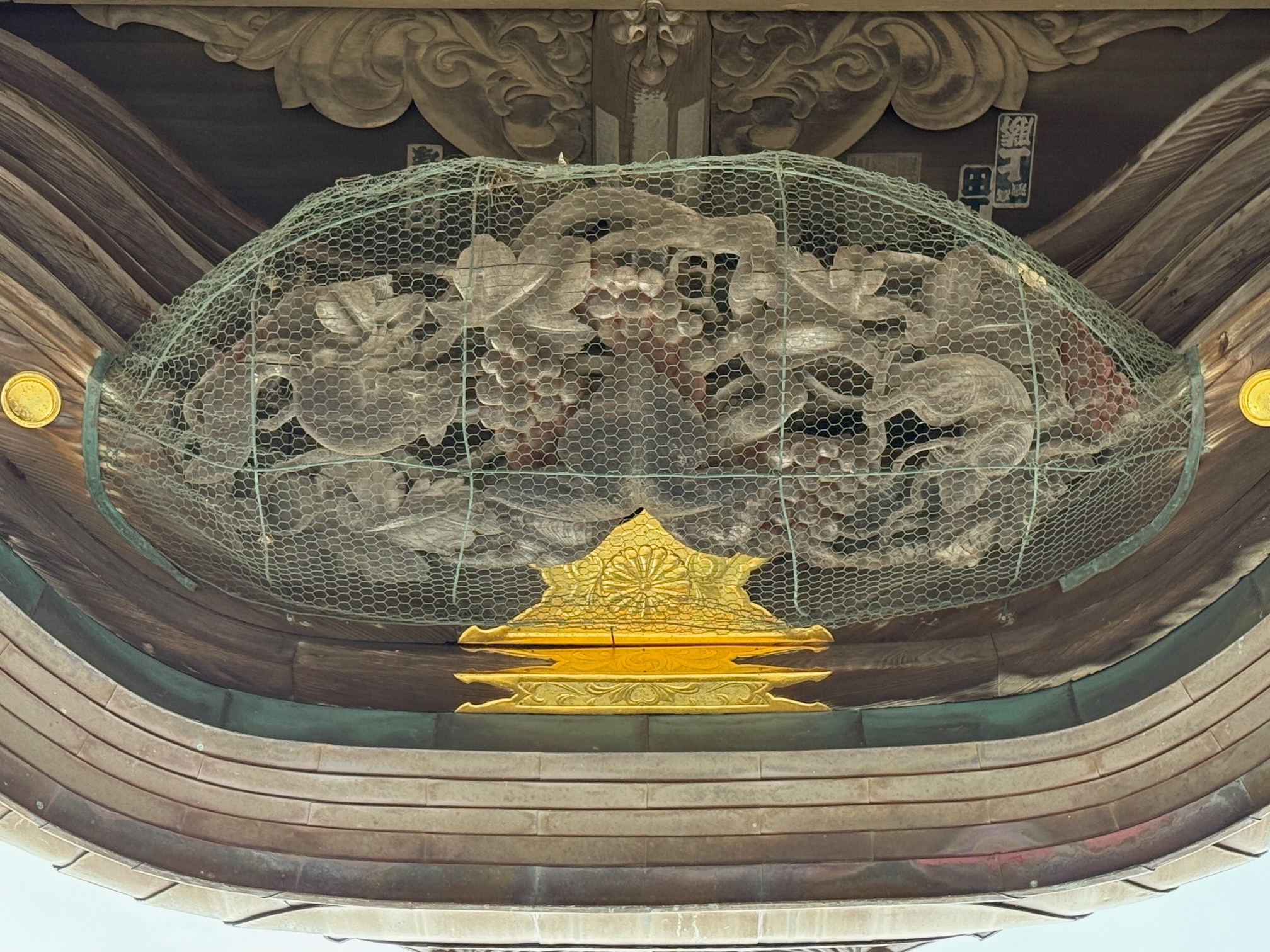 拝殿の正面を見上げると、立派な「リスとぶどうの彫刻」を目にすることができます。この彫刻は、日光東照宮の「眠り猫」を手がけたという江戸時代の名工・左甚五郎(ひだりじんごろう)の作と伝えられています。