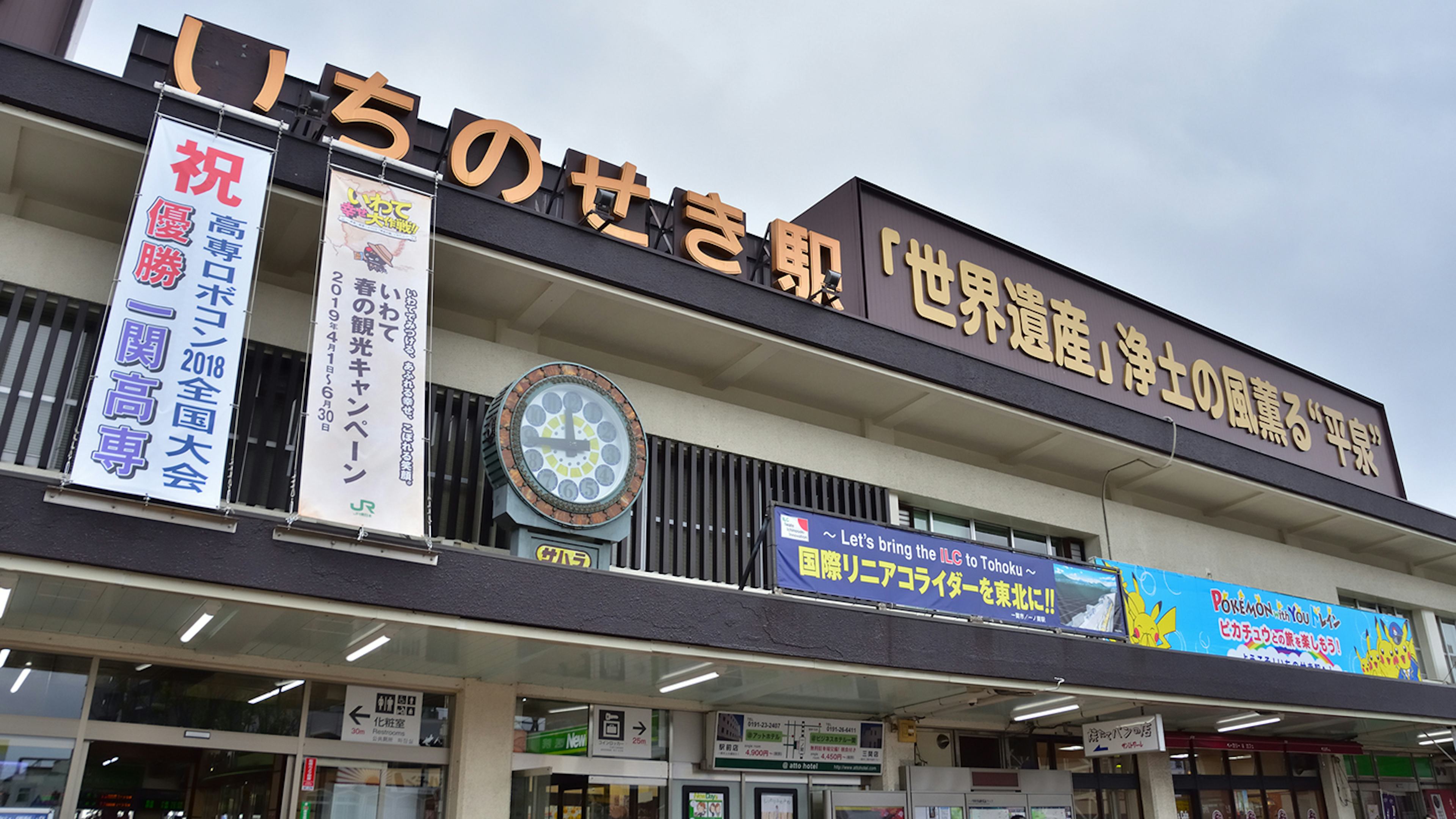 駅周辺には市街地が広がり、飲食店やお土産屋さんが充実しており、駅ビル内にも地元の銘菓や特産品を扱うショップがあります。また、世界遺産平泉への玄関口としても有名です。