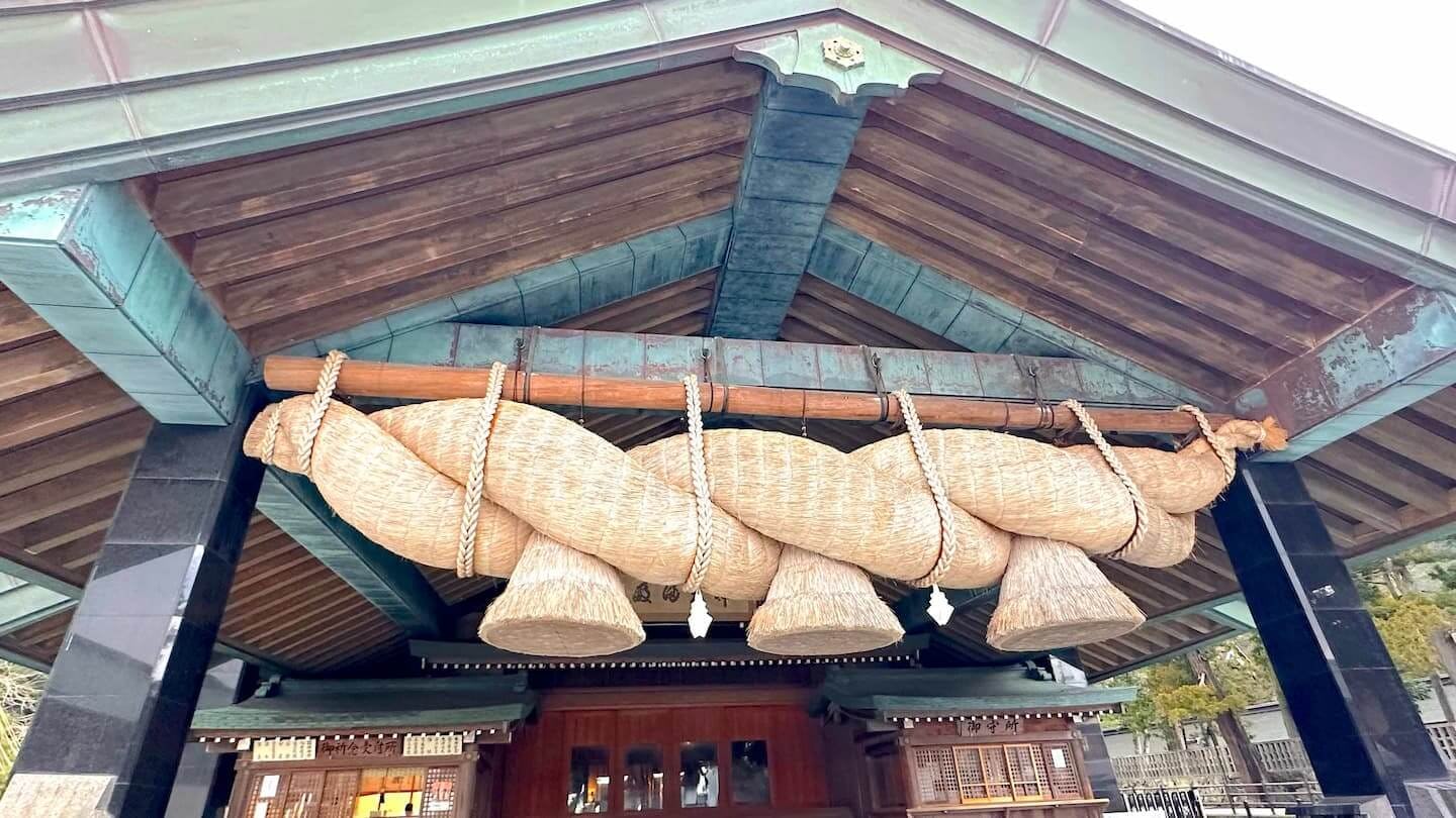 出雲大社の象徴である巨大なしめ縄は、本殿や拝殿ではなく神楽殿にあります。大しめ縄は長さが13.6メートルで重さは5.2トン!近づくとその大きさに圧倒されますよ。