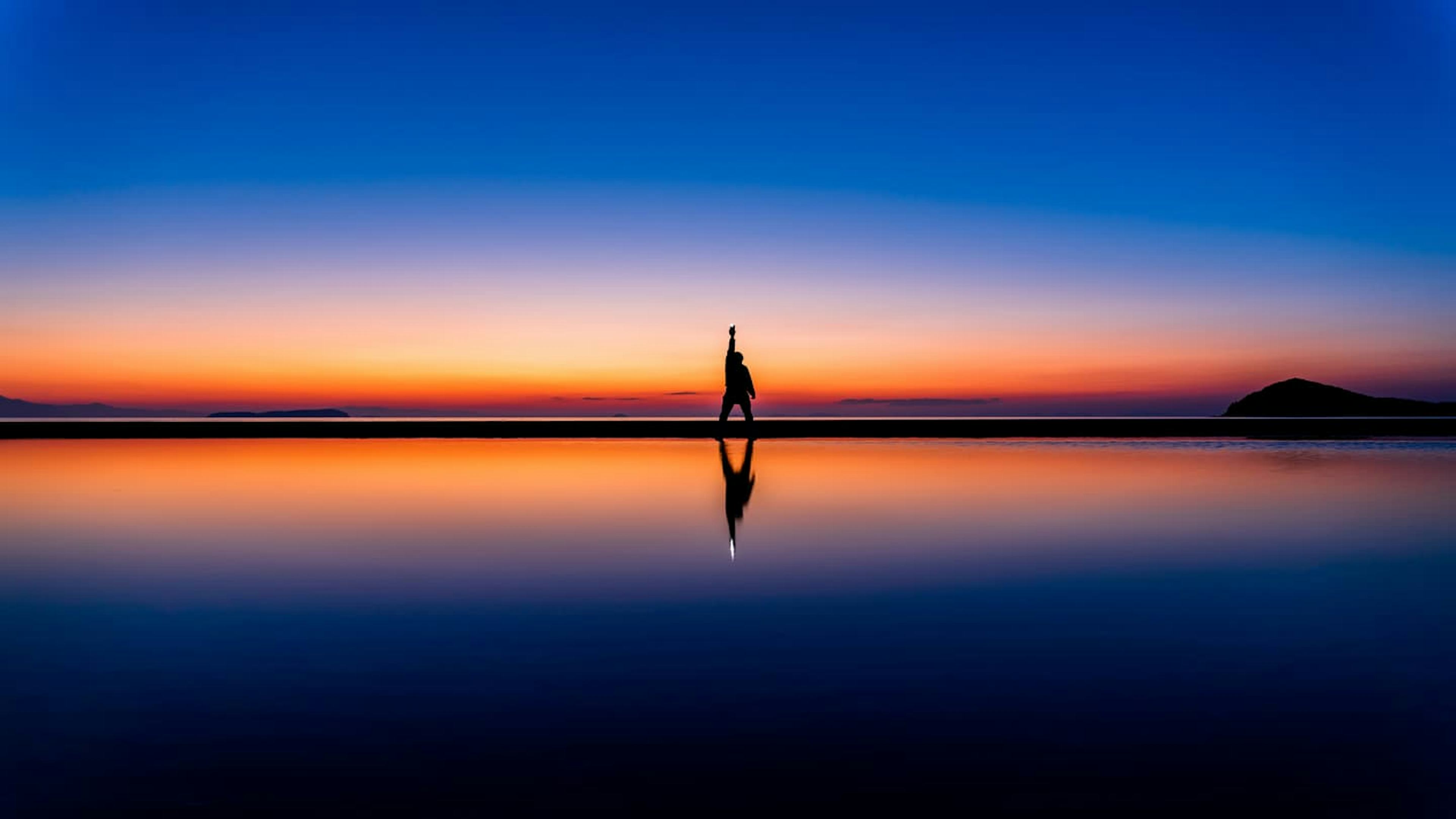 鏡に映りこんだような写真を撮影するには、干潮時に砂浜に現れる干潟(潮だまり)を利用します。その際、水面に波がなく、空や人が平面に映りこむことがポイント。比較的風が止みやすいのは夕暮れ時です。