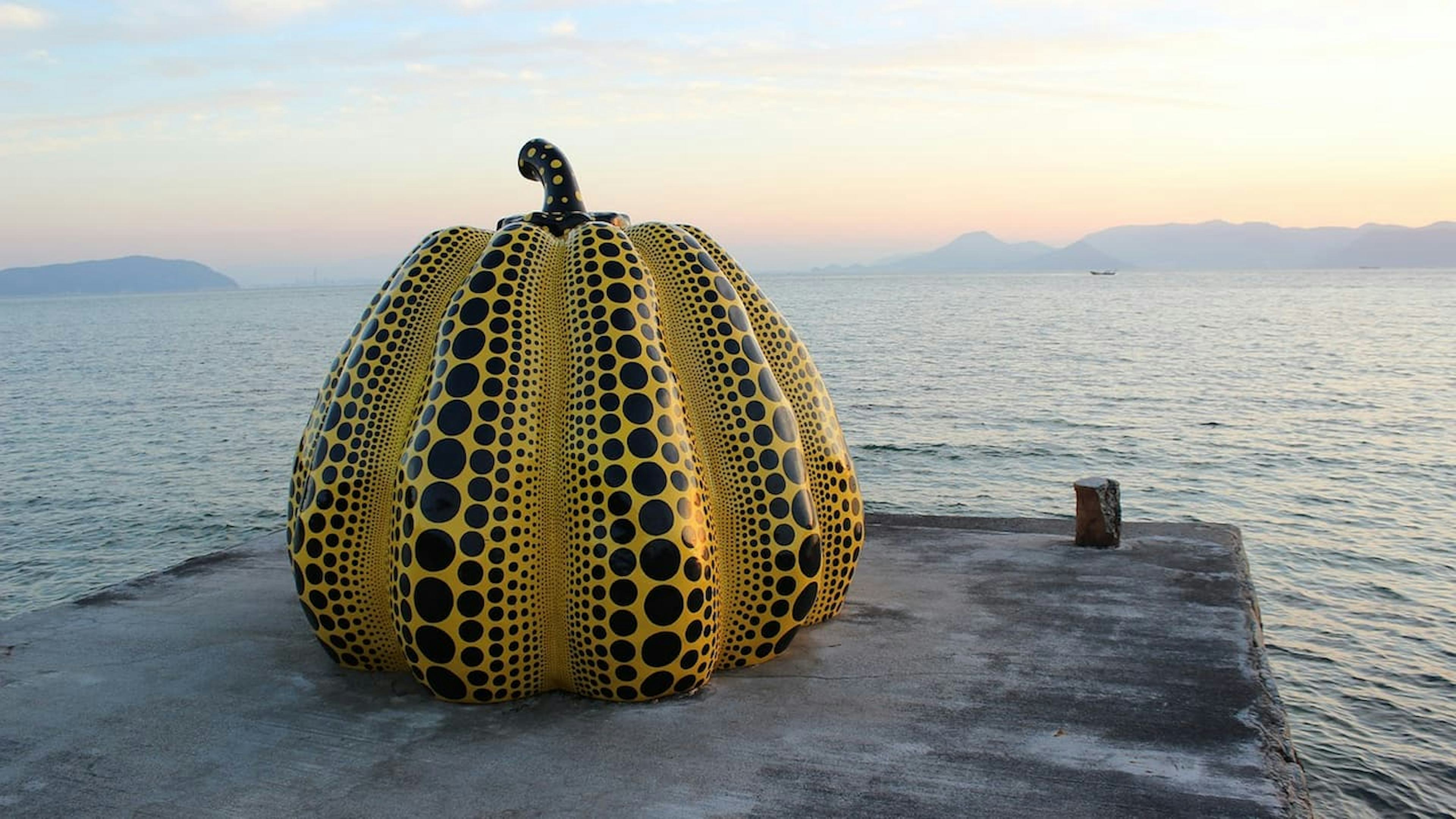 直島への旅は、宮浦港から始まります。港に降り立つと、真っ先に目に飛び込んでくるのが、草間彌生の代表作「赤かぼちゃ」。真っ赤な巨大なかぼちゃが、直島のアート島としての魅力を象徴しているんです。