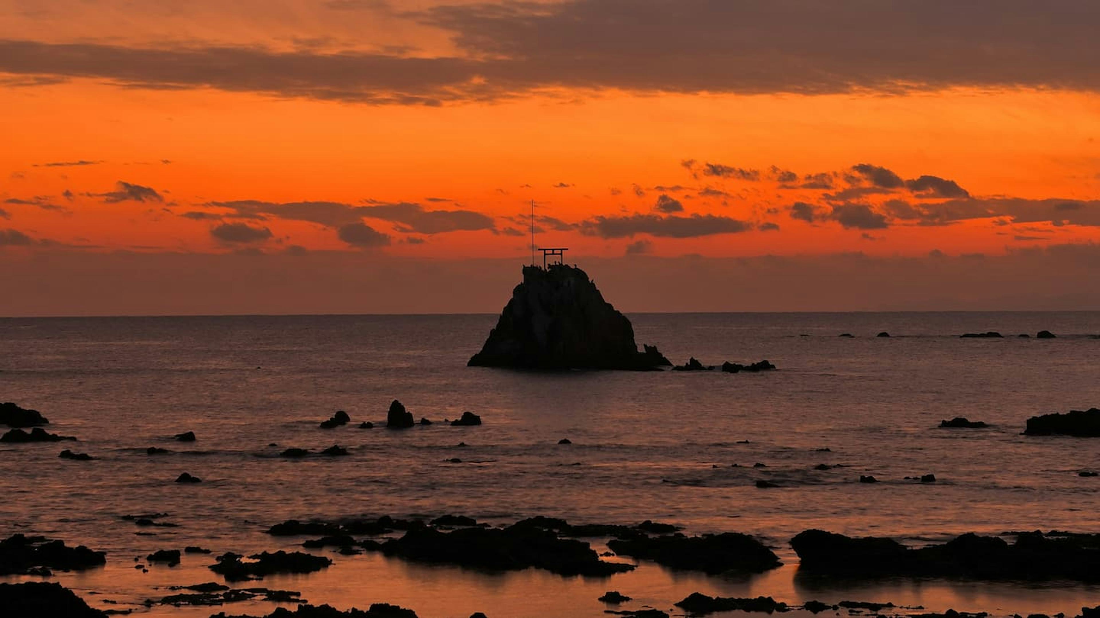 東シナ海に沈む夕日の名所として知られる「牛ノ浜景勝地」。国道3号線沿いに広がるこの海岸は、ごつごつとした奇岩や岩礁が独特の景観を作り出しています。特に、海の中から突き出す高さ20mの岩「スズメ瀬」の上に立つ真っ赤な鳥居は、とても神秘的!