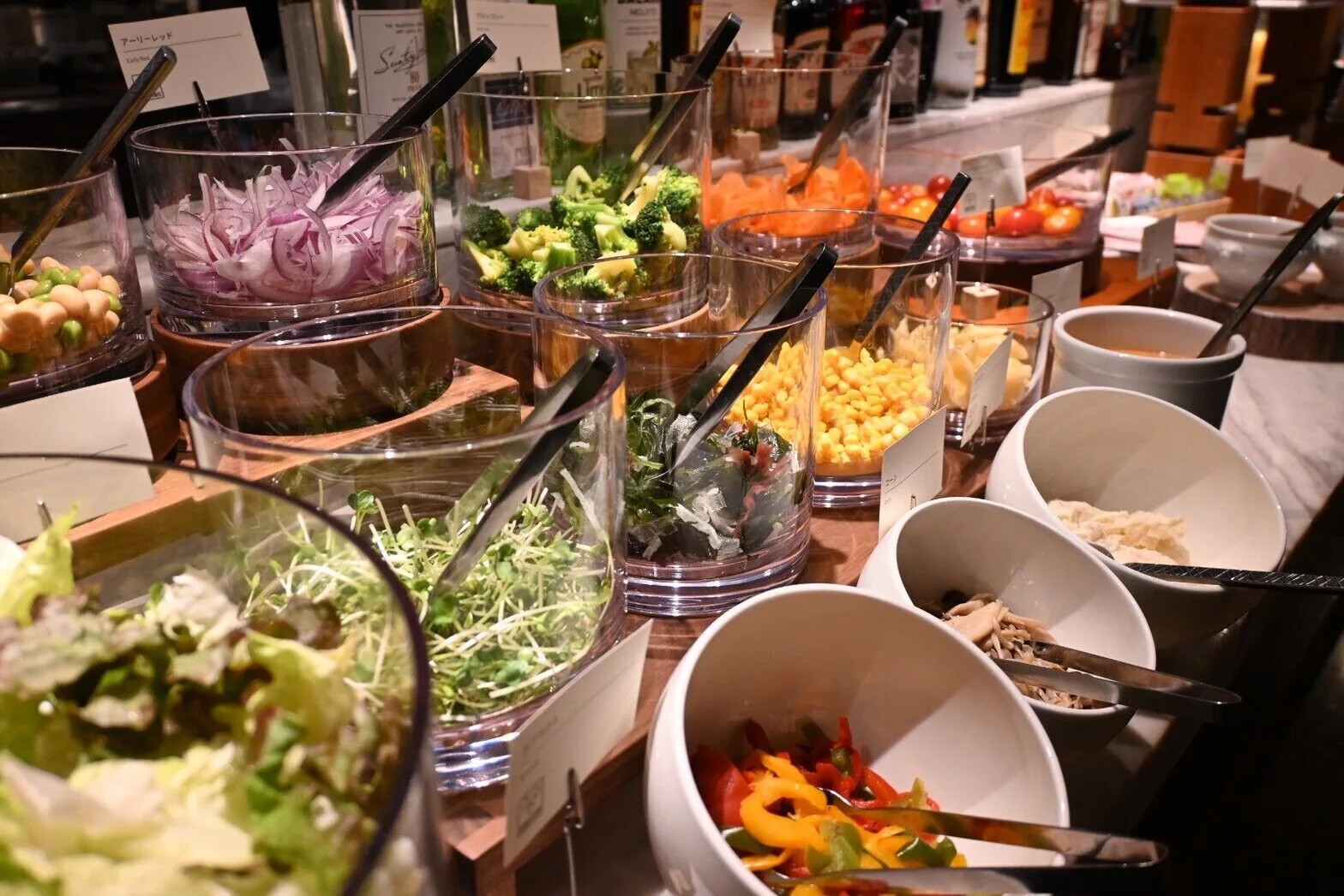 朝食は薪でていねいに焼き上げた野菜をふんだんに使うサラダビュッフェと、エッグベネディクトなど4種類のメインディッシュから選べるアメリカンブレックファースト。ドリンクビュッフェでは、スパークリングワインと淹れたてのコーヒーを用意しています。